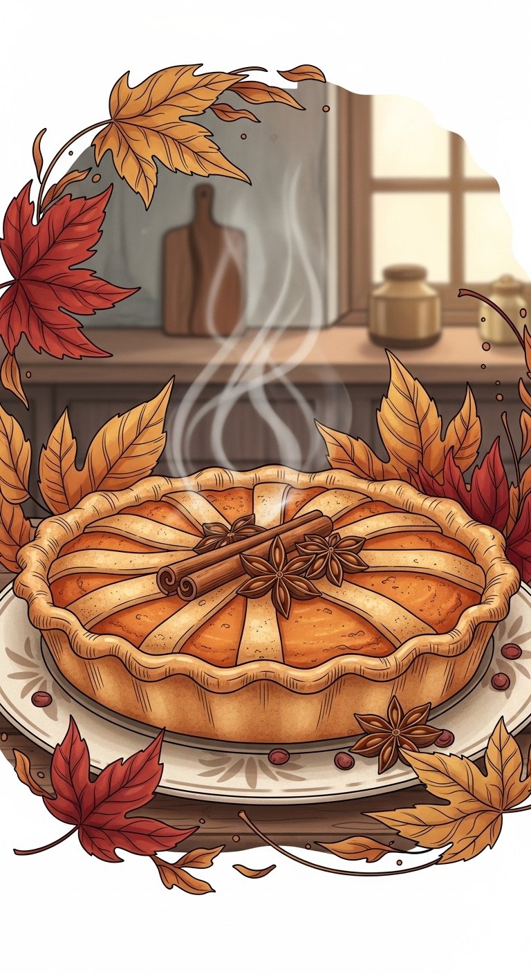 The design melds the homey comfort of the pie with seasonal transformation: the pie represents warmth, nourishment, and tradition while the encircling leaves signify change, cycle, and the beauty of impermanence.