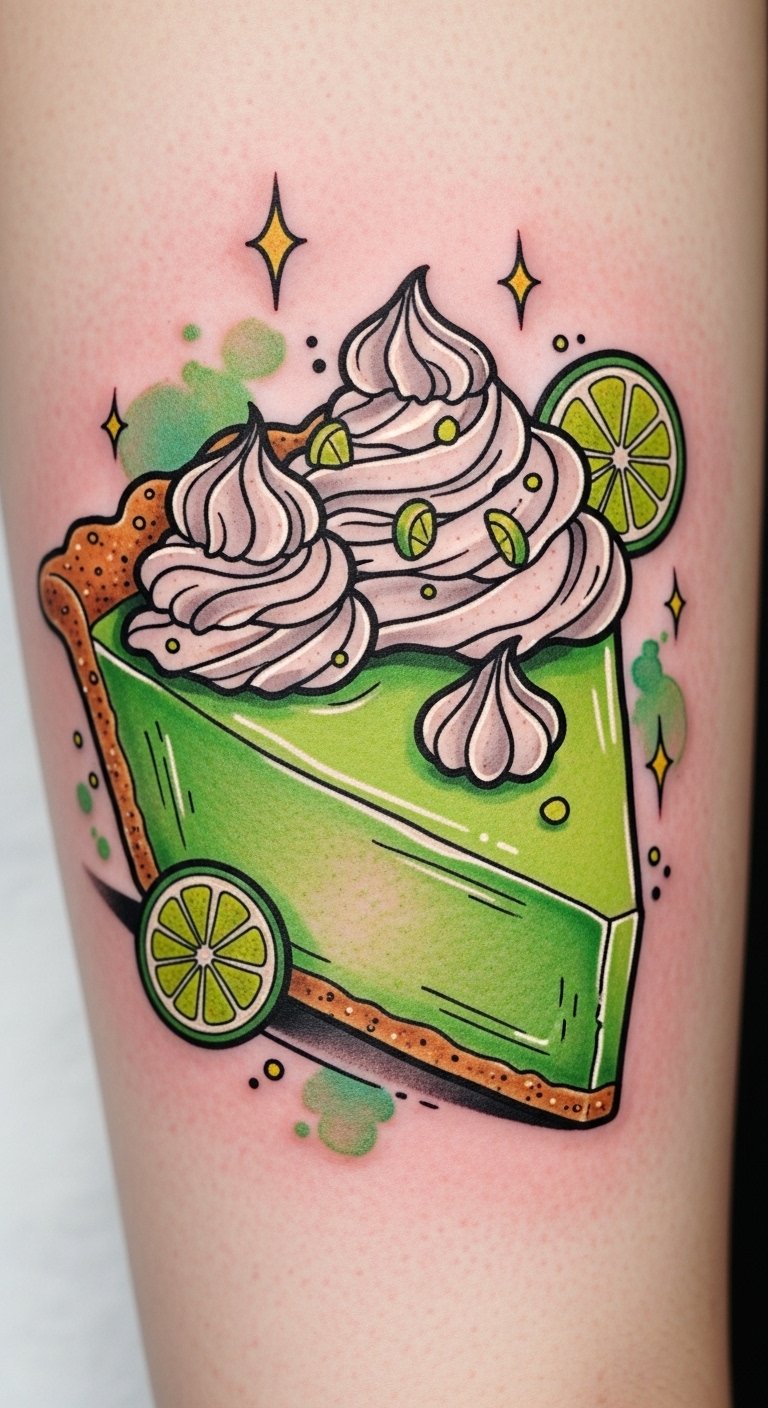 A vibrant key lime pie tattoo bursts with energy and zest, capturing the playful essence of this beloved dessert.
