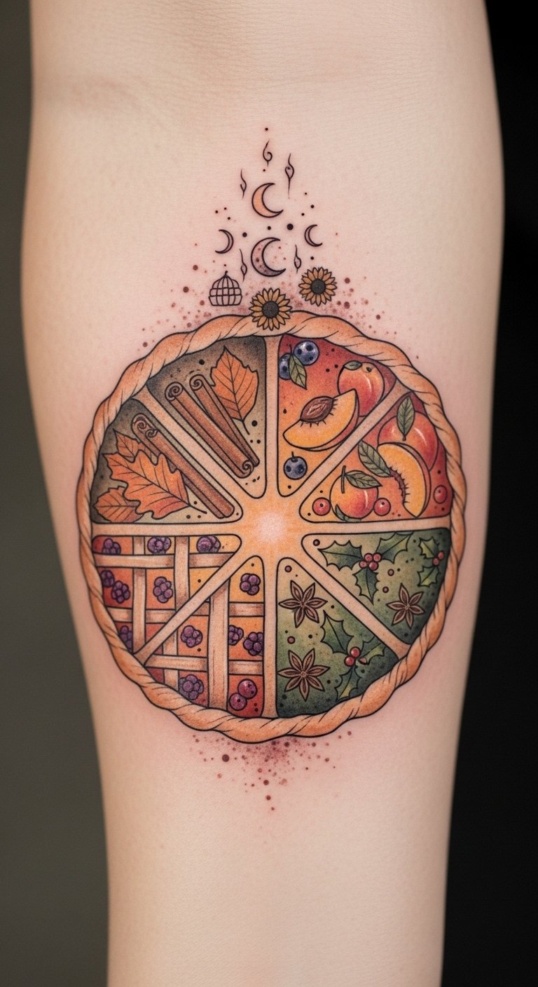 This design symbolizes cyclical abundance and comfort—the pie as home and hearth, the seasonal motifs representing time’s passage and memory. It evokes warmth, nostalgia, and joyful gatherings; place it on the forearm or upper arm for visibility and as a personal talisman of culinary and seasonal rhythms.