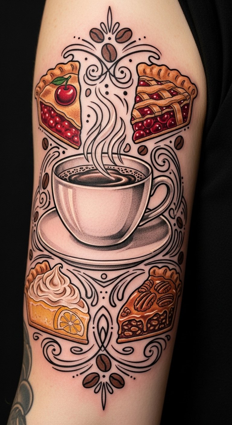 A compact forearm or chest piece where a stylized steaming cup sits central, steam curling into lattice-crust patterns, miniature pie slices and coffee beans orbiting like constellations; warm sepia and muted cinnamon tones with fine-line shading to evoke warmth and intimacy. The design symbolizes comfort, ritual, and the harmonious pairing of small joys; emotionally it reads as a personal ode to cozy routines and shared treats. Ideal placements: inner forearm for visibility and daily reminder, or left chest near the heart for a more intimate nod to sentimental indulgence.
