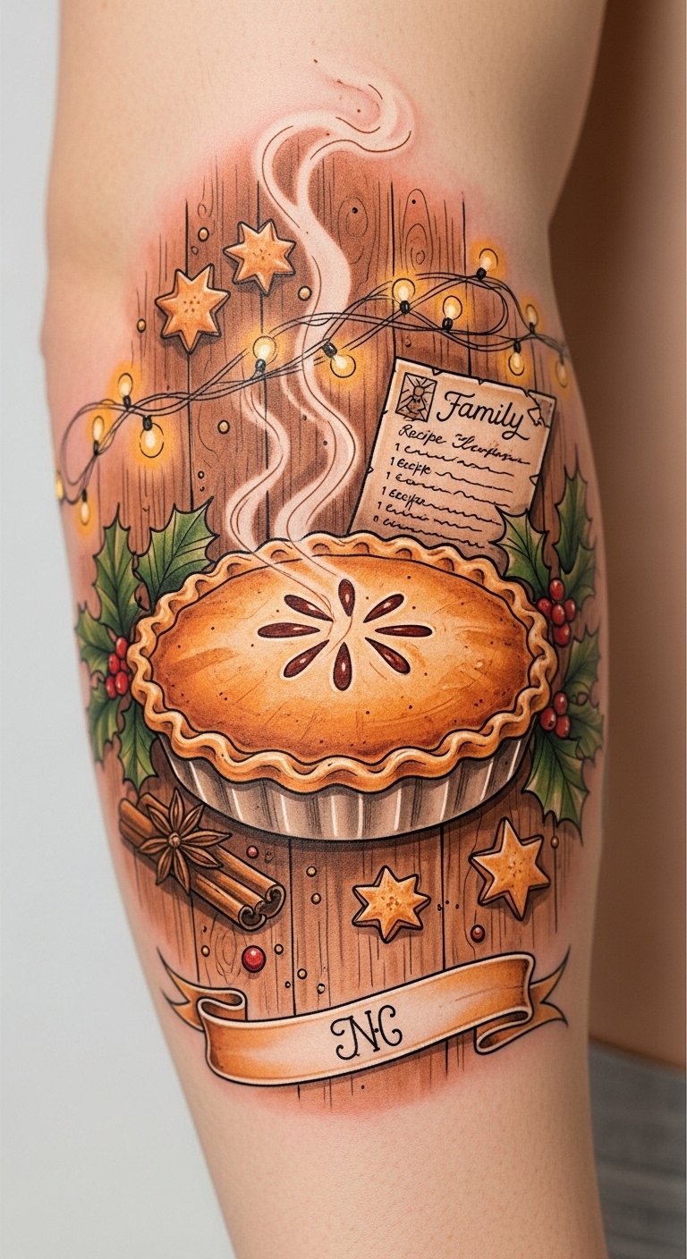 A delicate forearm or ribcage tattoo combining a vintage pie on a pedestal, steam lines forming a soft halo, and surrounding kitchen elements—rolling pin, whisk, enamel mug, and string lights—interwoven with tiny seasonal motifs (apple slices, cinnamon sticks, pumpkin leaves). The design symbolizes warmth, tradition, and the comforting rituals of home baking; its gentle curves and fine-line shading evoke nostalgia and hospitality. Ideal placement: inner forearm for daily reminder of familial connection or lower ribcage for a more intimate, personal emblem.