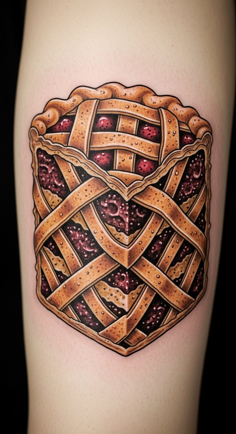 Ideal placements include the forearm, shoulder blade, or calf where the rounded pie shape and whipped swirl can be showcased; scale and color can be adjusted for a small wrist piece or a larger, more detailed back or thigh tattoo.