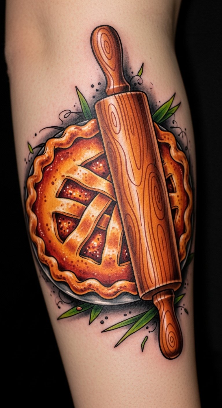 Emotionally warm and playful, it suits placements that allow detail and color to shine—forearm, upper arm, calf, or shoulder blade—where the curved pie and long rolling pin can wrap with the body’s contours and be shown or concealed as desired.