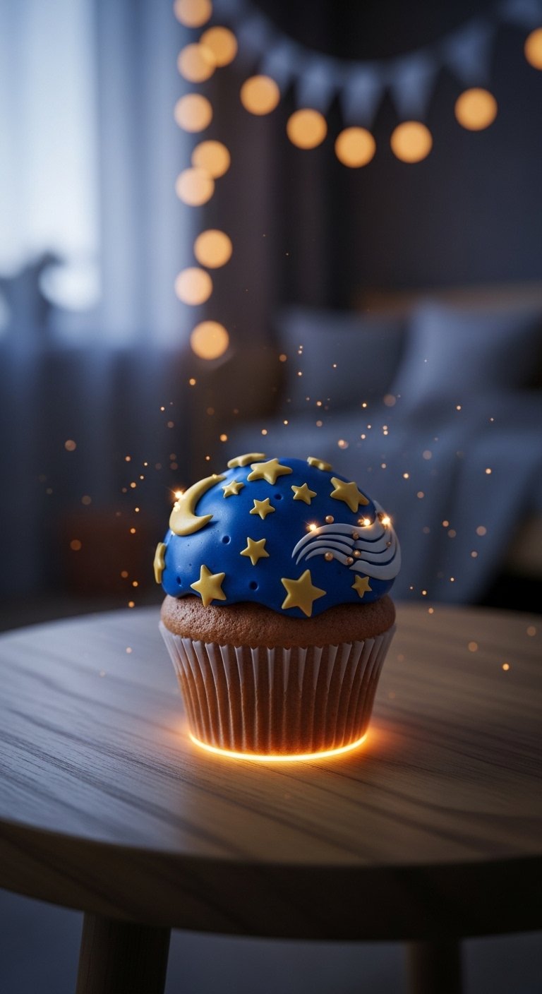 The cupcake tattoo combines playful imagery and celestial motifs to symbolize joy, individuality, and the pursuit of wonder; the starry frosting suggests guidance and dreams, while the cupcake base grounds the design in comfort and celebration.