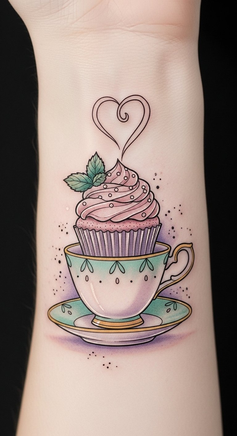 Imagine a vibrant teacup design cradling a delightful cupcake, bursting with colors and flavors. This tattoo captures your cupcake inspiration, symbolizing a love for life’s little pleasures. It’s a playful reminder to embrace your individuality, making each day feel like a celebration. Who wouldn’t want that?