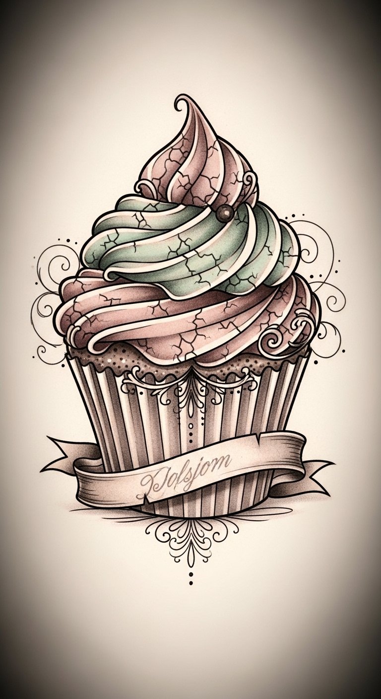 Sweetness takes on a nostalgic charm with the vintage cupcake tattoo, elegantly adorned with a banner that can carry a personal message or a favorite quote.