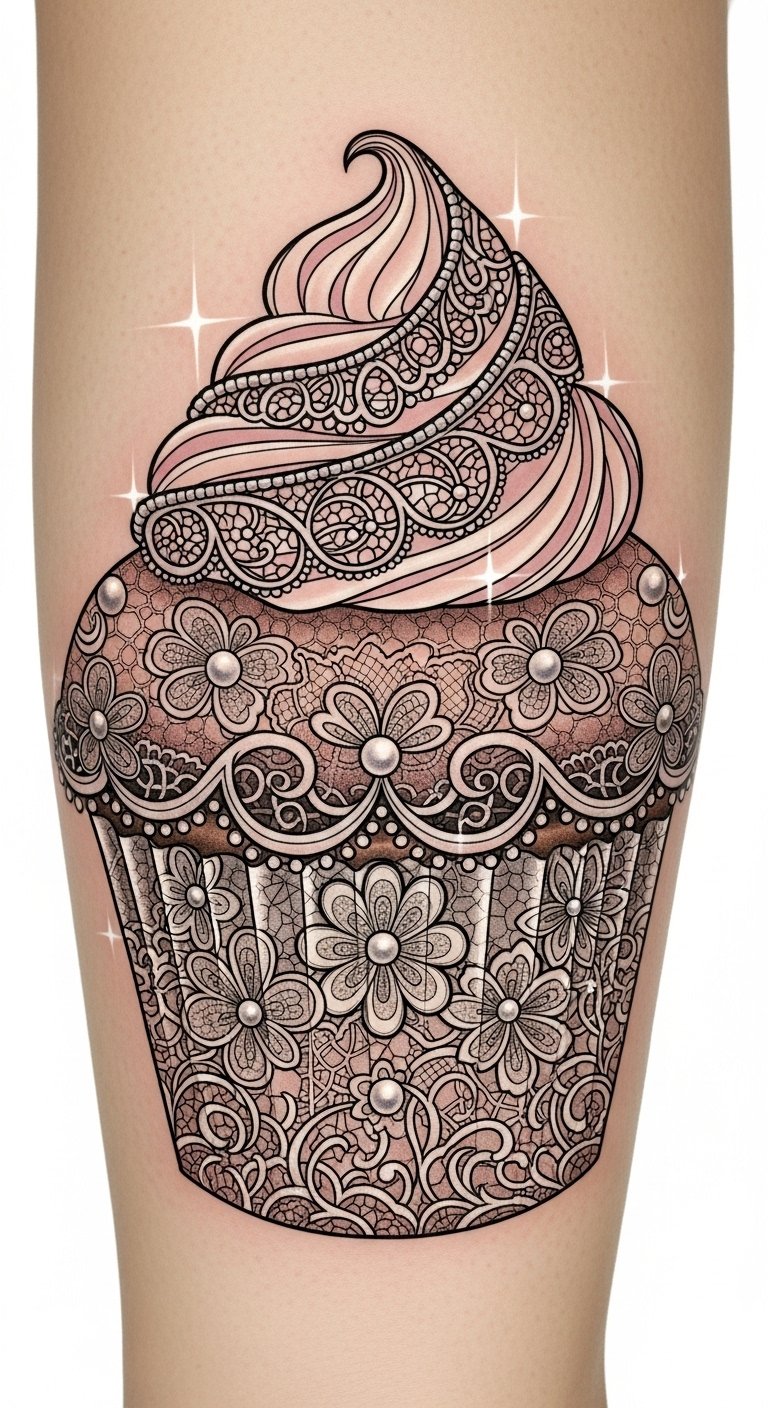 An elegant cupcake adorned with intricate lace designs brings a touch of sophistication to the tattoo world, blending whimsy with artistry.