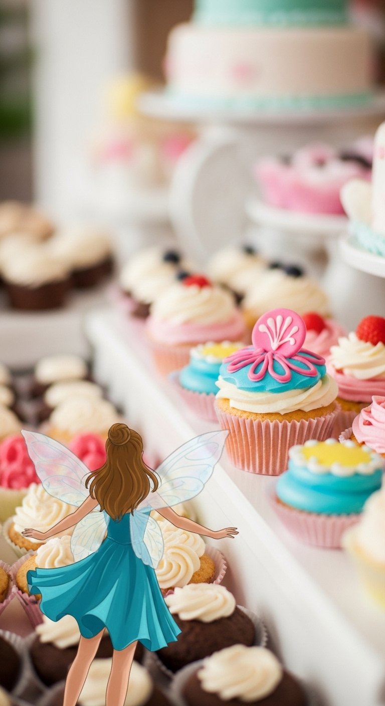 Symbolically this design blends indulgence and imagination—freedom and creativity are expressed through the fairy’s motion and the cupcake’s intricate decorations—evoking playful joy and personal celebration when viewed or touched.