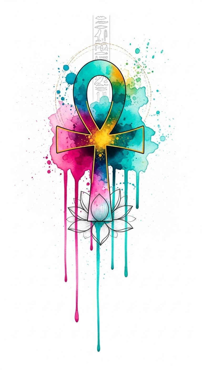 The design concept centers an ankh rendered with a fusion of hieroglyphic texture and sleek contemporary linework, combining aged papyrus cracks at the loop with vivid watercolor splashes radiating outward.