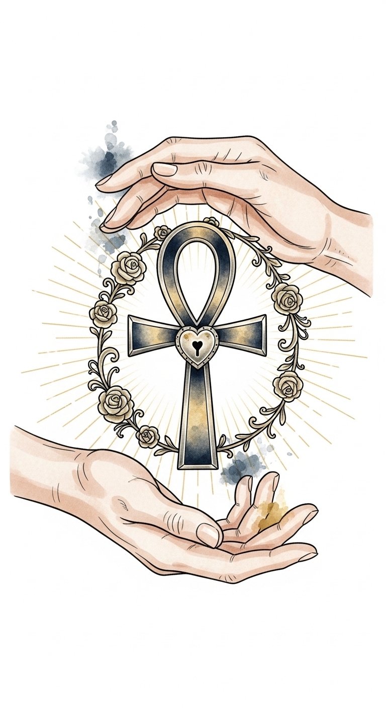 Ideal placement is over the chest near the heart, inner forearm, or upper back so the hands cradle the ankh toward the viewer; the design evokes tender remembrance and quiet strength, combining classical Egyptian symbolism with personal mementos to convey comfort and ongoing presence.