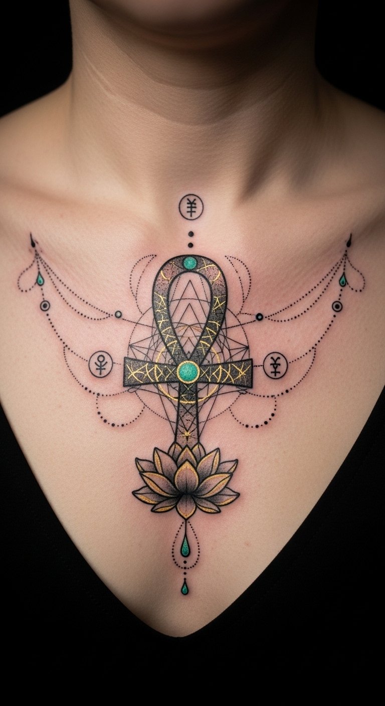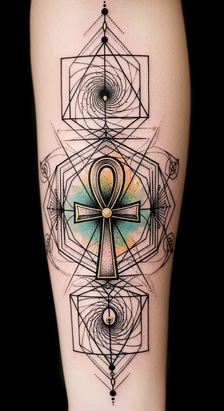 Each line and shape resonates with geometric symbolism, empowering your spirit and reflecting your desire for freedom. Embrace the fusion of tradition and innovation, and let your Ankh tattoo become a canvas of profound connection.
