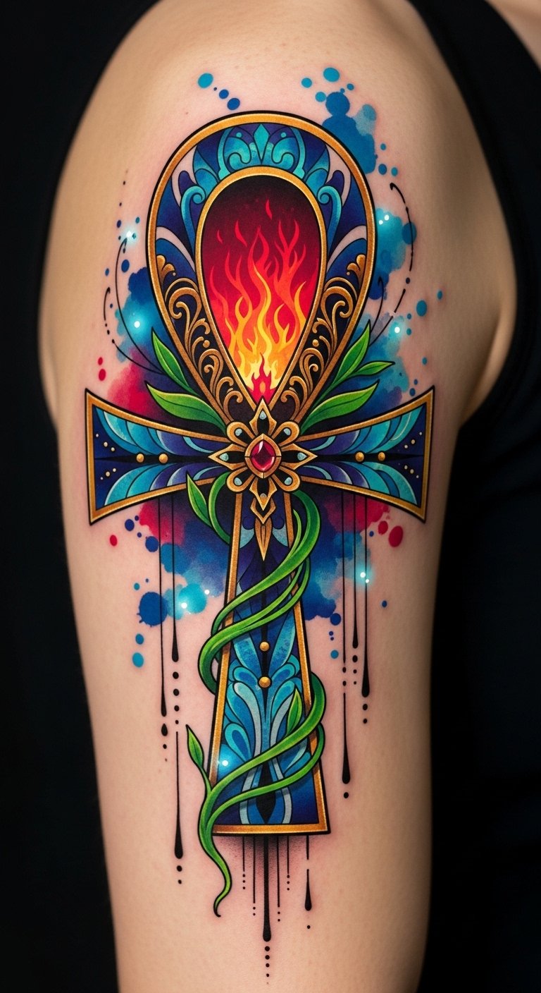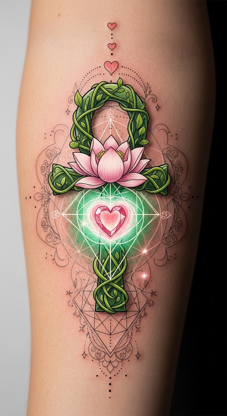 This design weaves the ankh with heart-chakra colors and organic elements to evoke tenderness, healing, and unity; place it over the sternum or on the inner forearm where the radiating light can symbolize openness and personal transformation.