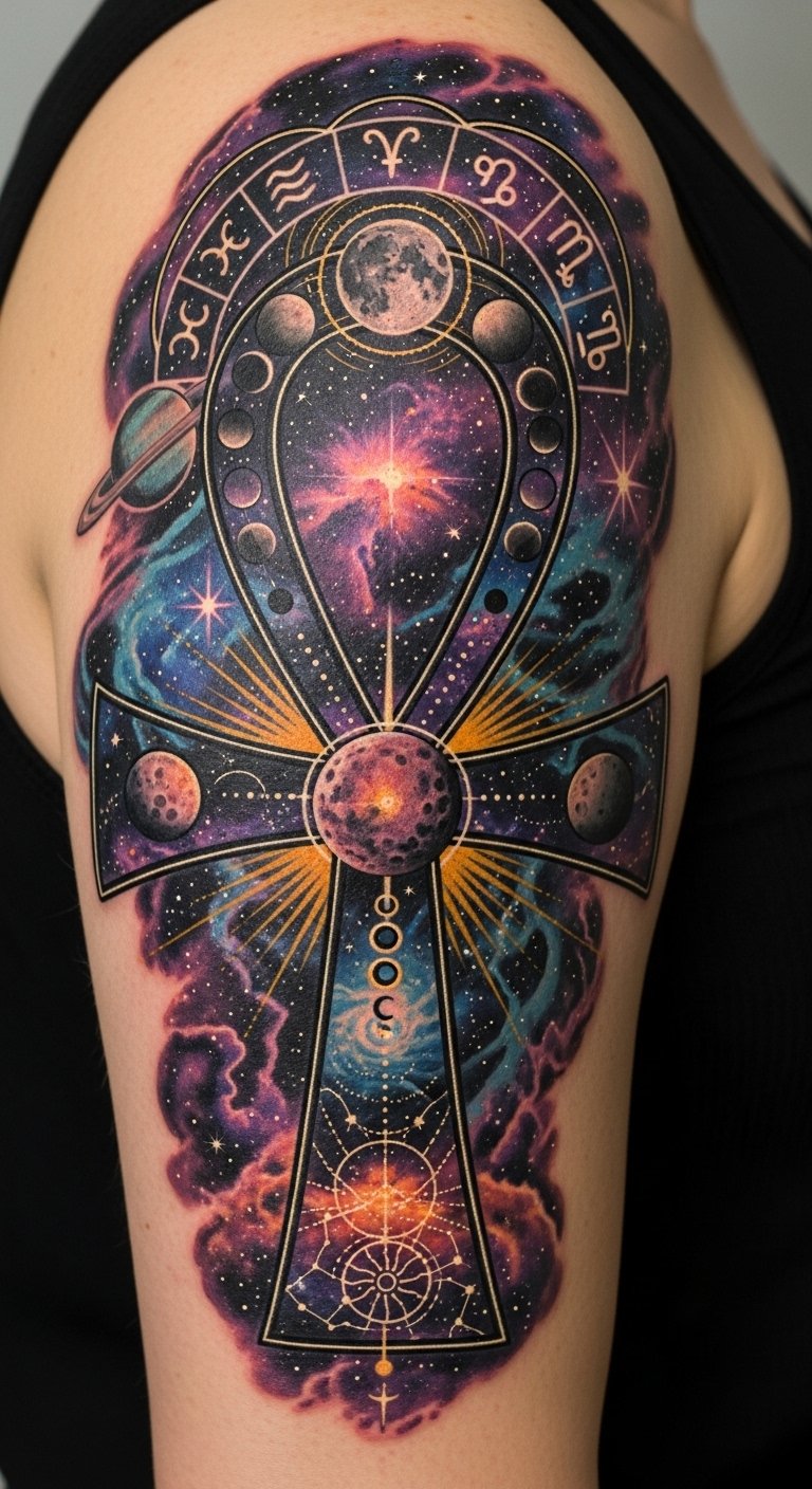 This design blends the Ankh’s life-and-immortality symbolism with cosmic imagery to evoke wonder and timeless connection; place a detailed Ankh at the center, filled with a swirling nebula in vivid blues, purples, and gold, a crescent moon cradling the loop, tiny star clusters radiating outward, and subtle zodiac glyphs along the vertical shaft to personalize astrological meaning. Emotionally it should feel expansive, serene, and empowering—ideal for forearm, upper back between the shoulder blades, or sternum placement where the vertical composition follows the body’s natural lines and allows for medium-to-large scale detail.