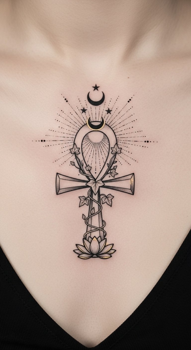 Have you ever felt a pull towards symbols that resonate with your inner journey? The ankh, with its deep roots in ancient wisdom, offers more than just a decorative design. It serves as a pathway to understanding life, eternity, and your own spiritual evolution. Each tattoo can become a personal talisman, inviting you to explore the layers of meaning within. Let’s uncover how these enchanting tattoos can transform your spiritual connection and reflect your unique path. This design blends the ankh’s timeless symbolism (life, continuity) with celestial and botanical elements to evoke renewal and balance; the crescent and sun suggest cycles and illumination, the vine and lotus buds imply growth and spiritual awakening, while dotwork and warm sepia inks create an intimate, contemplative mood. Ideal placement is the inner forearm for frequent reflection or over the heart on the chest to signify deep personal resonance; scale can be adjusted for a subtle or statement piece depending on emotional intent.