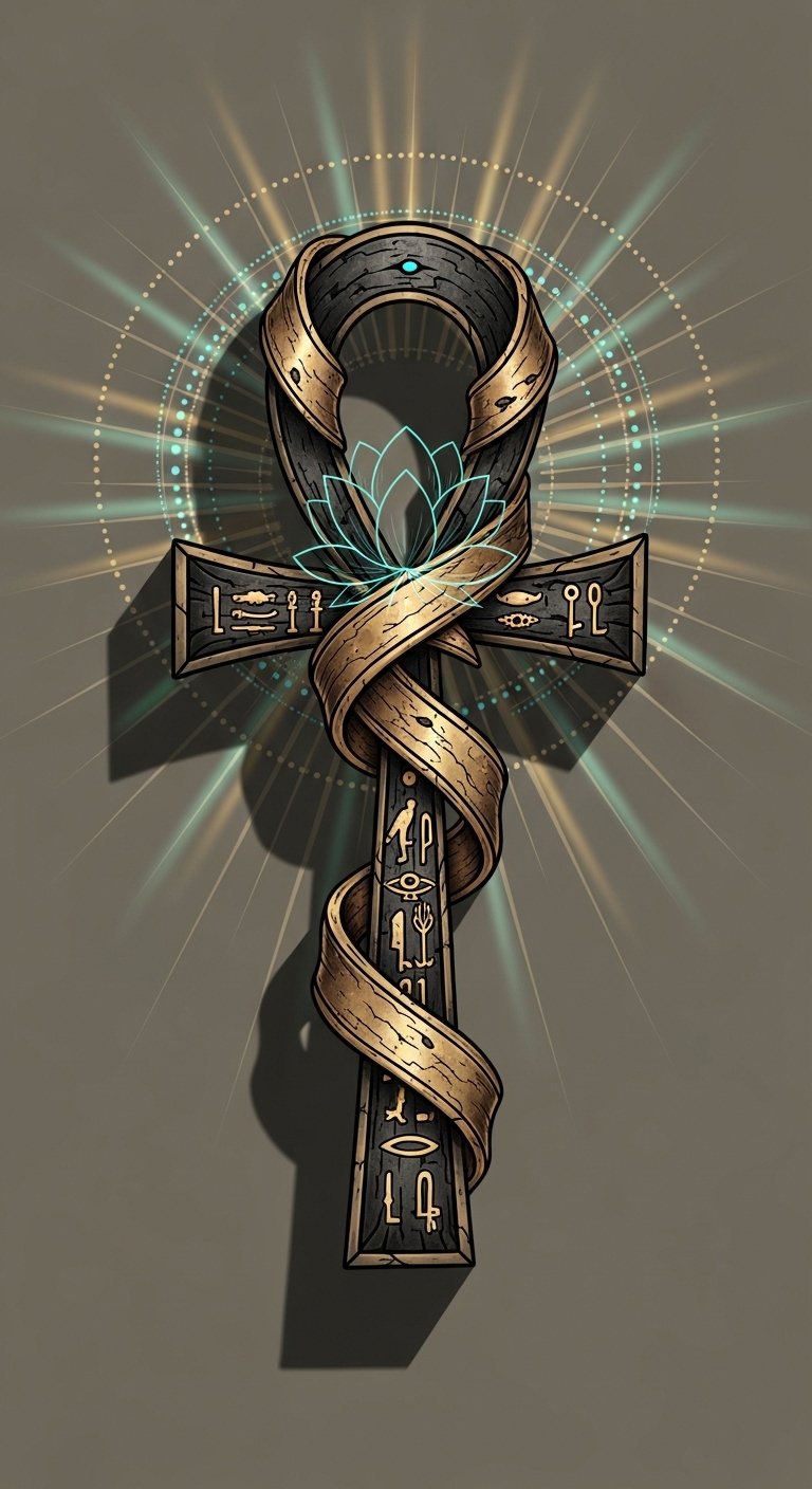 This design channels those themes through the gilded ankh—lotus petals for rebirth and wheat for sustenance—evoking serenity and reverence; the warm ochre and turquoise evoke Nile light and healing.