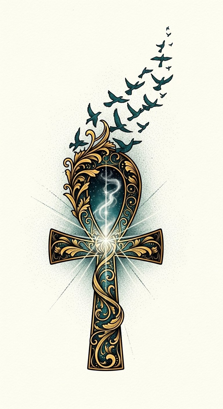 Symbolism, emotion, and placement: The tattoo concept ties the ankh’s traditional meanings of life and eternal balance to the four stripes—interpretable as the stages of existence or the four elements—using metallic silver for timelessness and deep teal for renewal; dotwork and smoke add introspective, meditative mood.