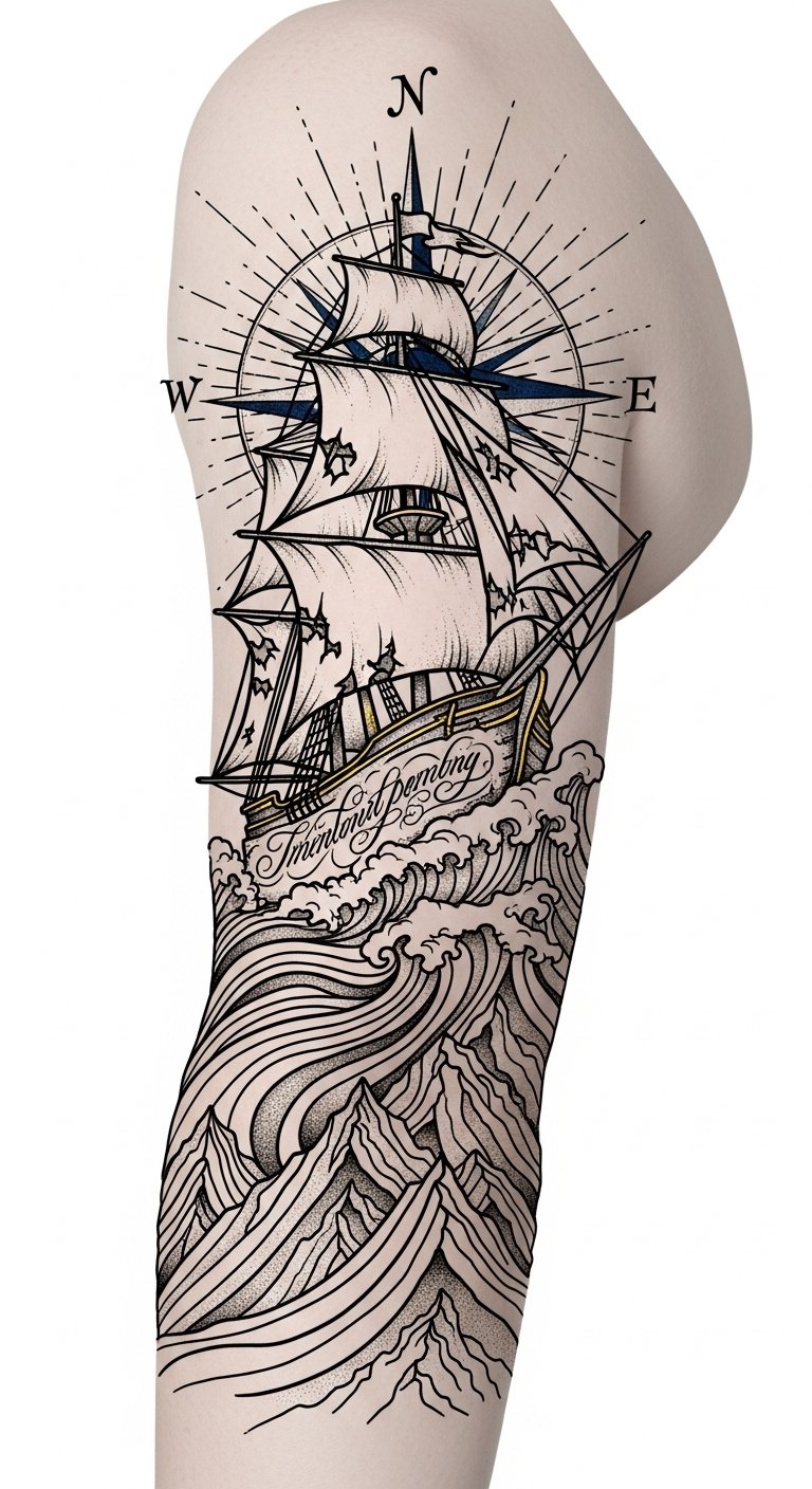 The design uses the ship as a central symbol of personal journey and endurance, the stormy seas representing external hardship, and the mountains subtly formed from waves to indicate growth that emerges from struggle.