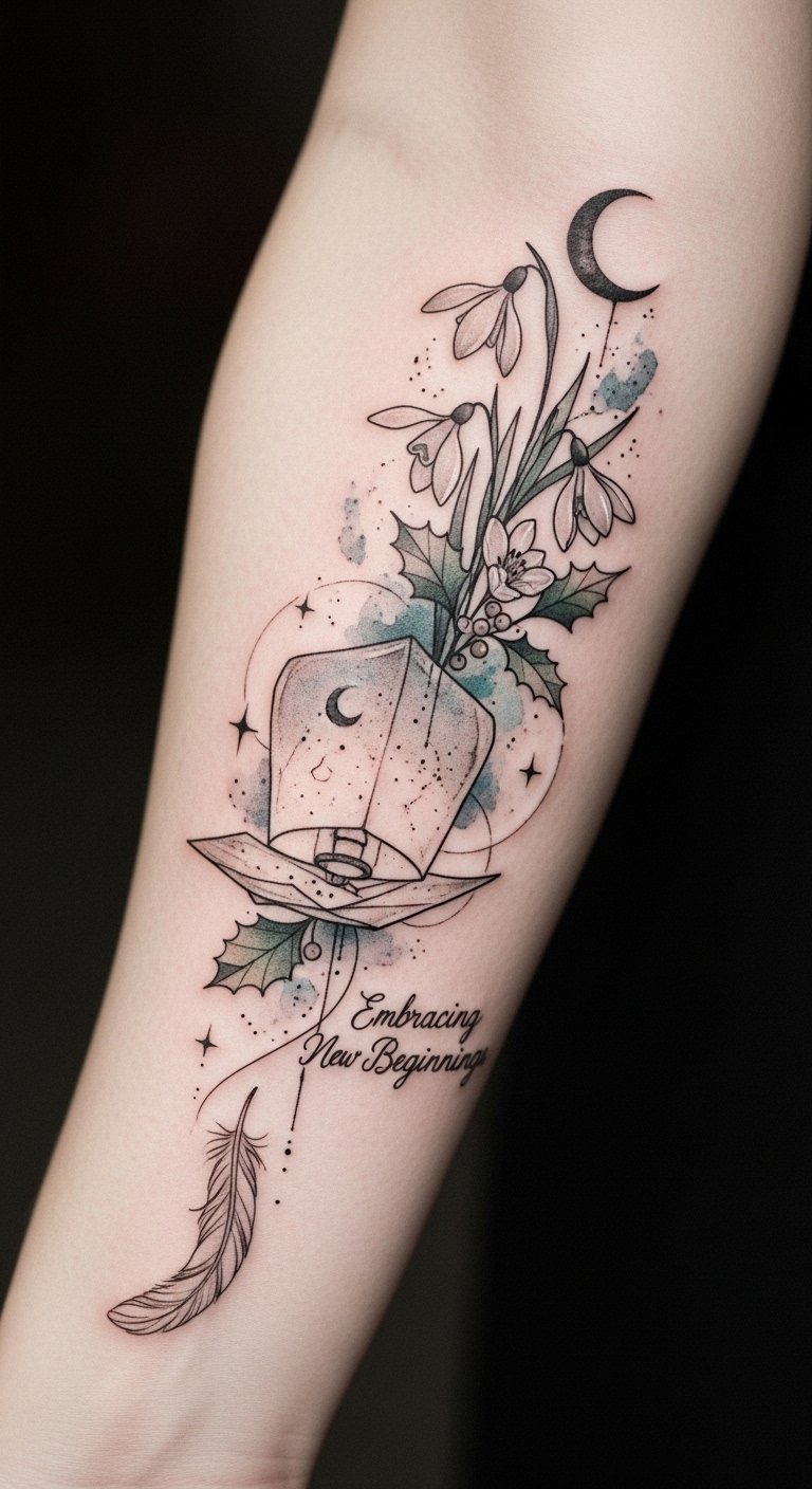Celebrate your journey, and allow these enchanting designs to remind you that freedom lies in every new chapter you create. This design uses snowdrops for hope and renewal, holly for protection and resilience, the paper lantern for guidance through change, and the feather for release; its upward flow along the forearm evokes forward movement and visible affirmation—ideal on the outer forearm where it can be seen as a personal talisman and conversation piece.
