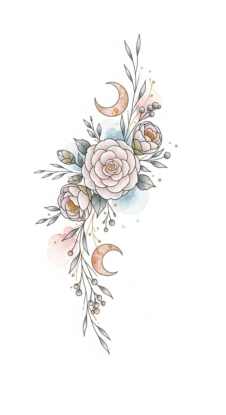 Each design becomes a reminder of your resilience and aspirations, empowering you to break free from limitations and embrace your authentic self with every inked petal. The design conveys renewal and inner strength through gentle, flowing lines and warm hues; the crescent moon and stars add guidance and hope.