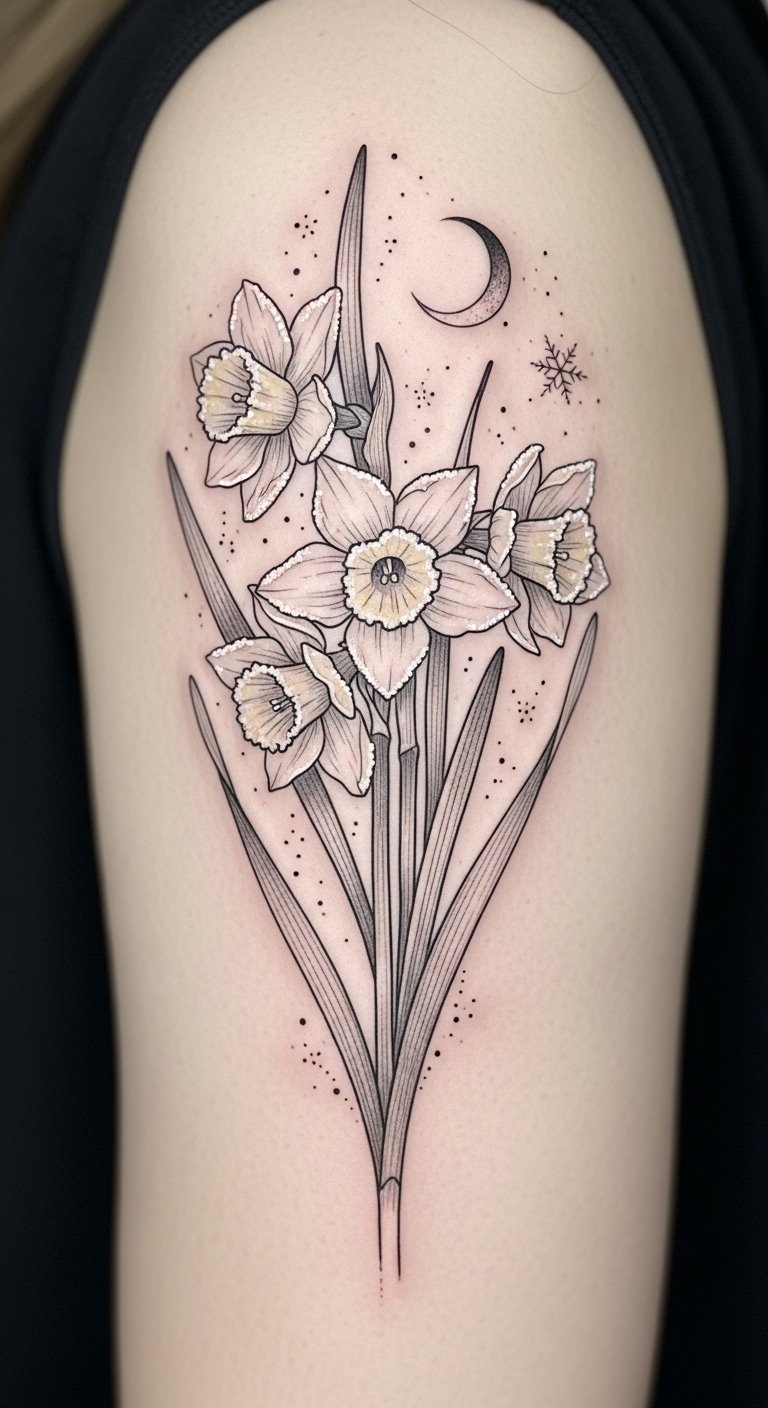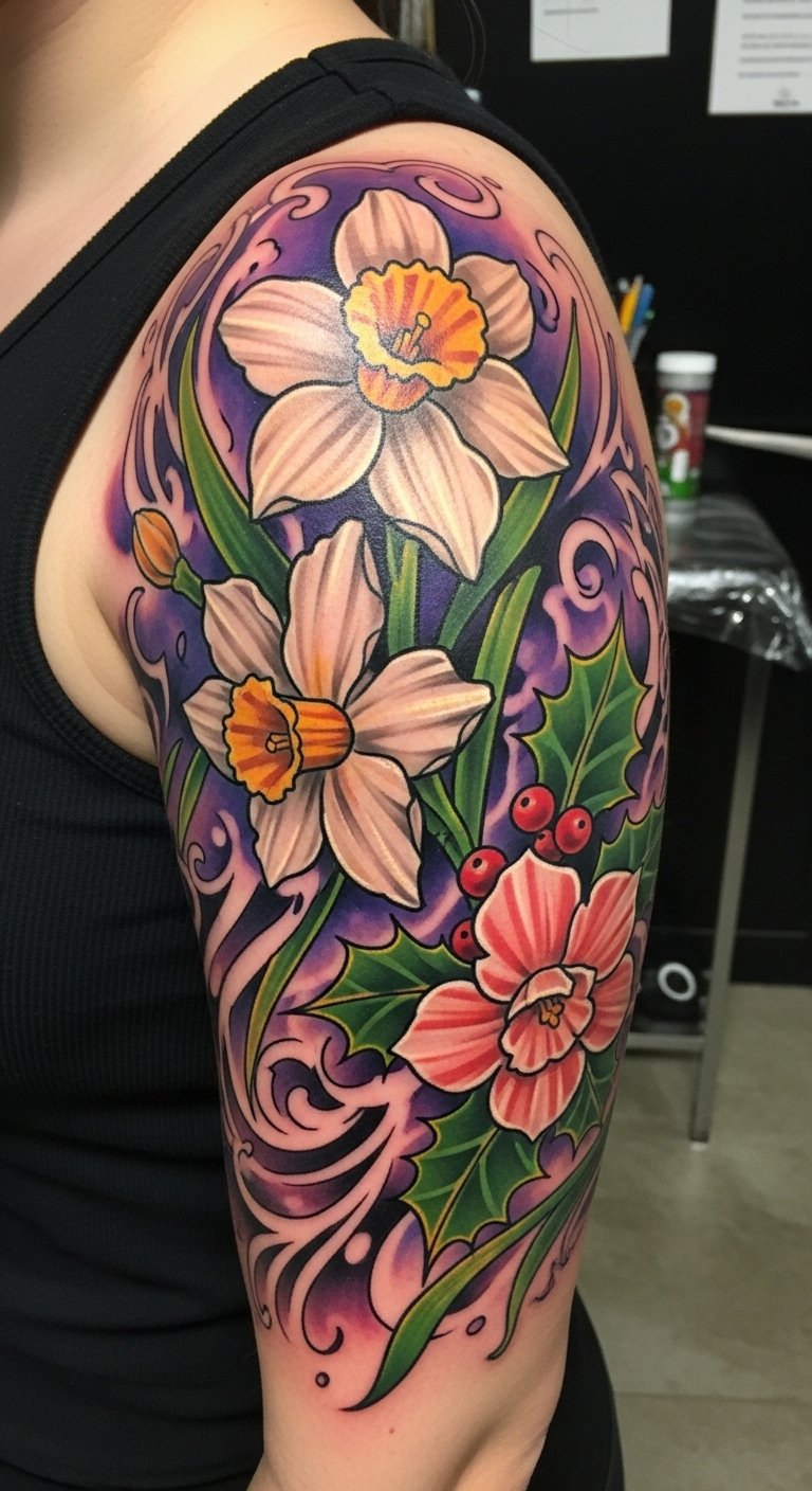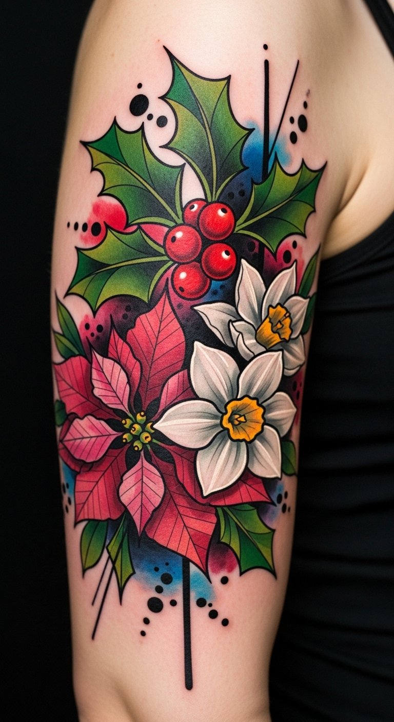 This design uses the holly’s resilience, poinsettia’s warmth, and narcissus’s purity to symbolize endurance, celebration, and renewal; placement on the forearm or shoulder allows visibility and personal interaction while the strong lines ensure longevity and visual impact.