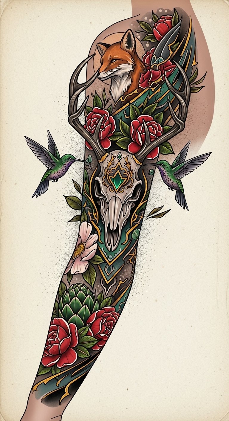 Emotionally the composition conveys strength softened by tenderness, suited for a forearm-to-shoulder sleeve where the flow wraps musculature—placement allows the stag skull at the upper arm/shoulder for prominence, flowers cascading toward the wrist to guide the eye and integrate with existing tattoos or become a standalone statement.
