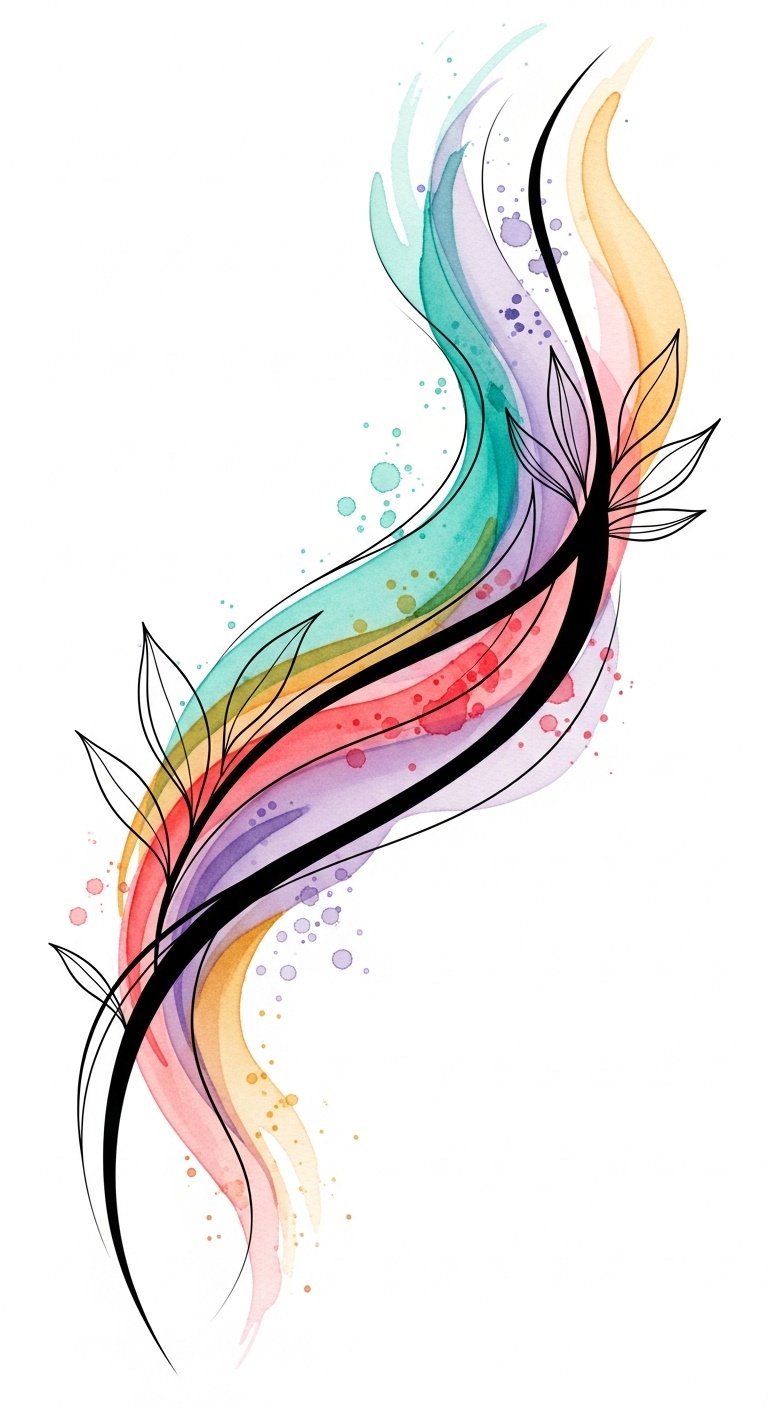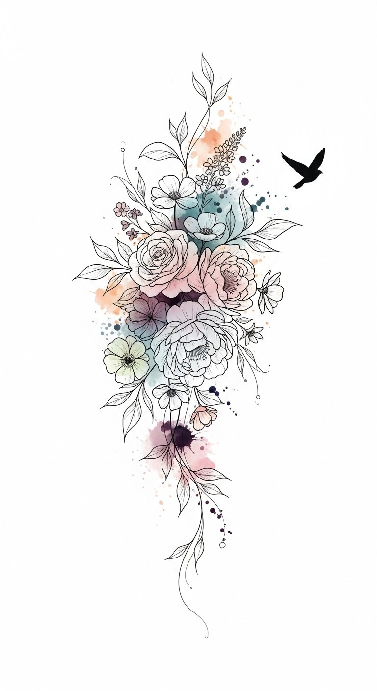The flowing script and vertical composition emphasize movement and freedom, encouraging interaction and conversation when the forearm is exposed. Delicate linework and watercolor accents evoke emotional softness and individuality, while negative space preserves breathability on the skin; place centered on the outer forearm so the piece reads clearly with the arm relaxed and becomes a subtle statement when lifted or extended.
