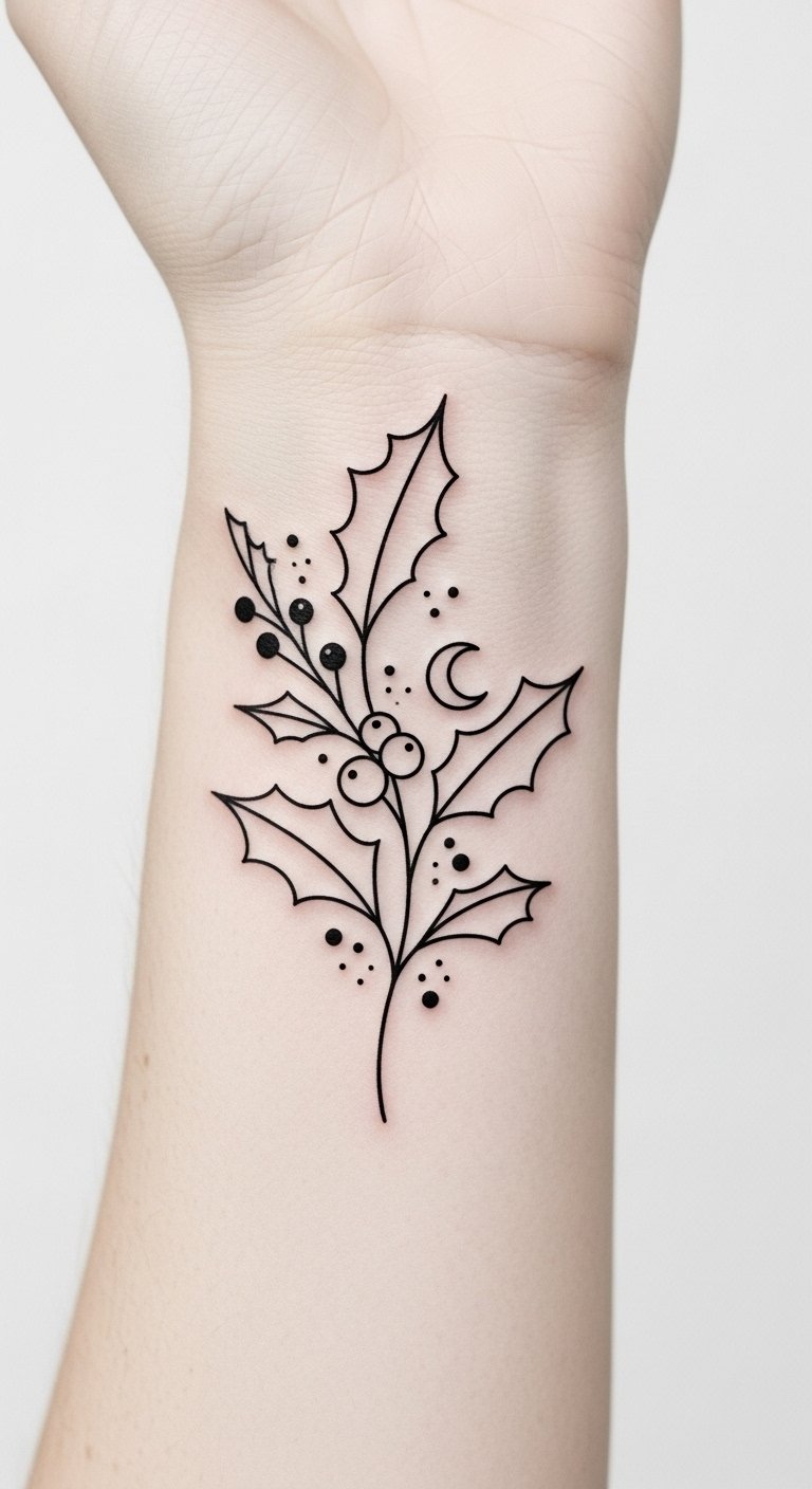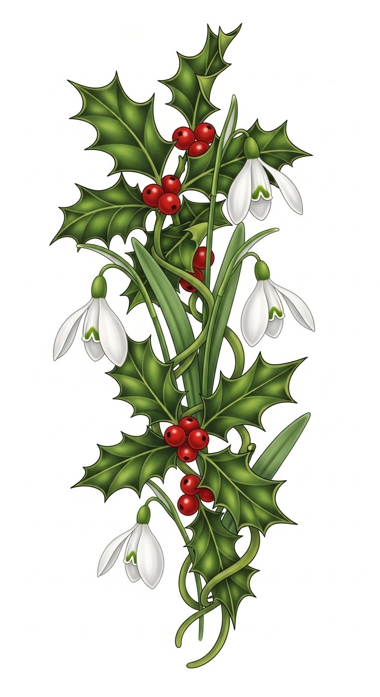 This design blends the fragile elegance of snowdrops with the bold, glossy holly leaves to convey resilience and joyous spirit; soft white petals paired with deep green and red accents create emotional contrast—gentle hope emerging from protective, festive foliage—suitable for forearm, ribcage, shoulder blade, or ankle where flowing lines can wrap and interact with the body’s movement, offering a personal emblem of nature’s beauty and individual strength.