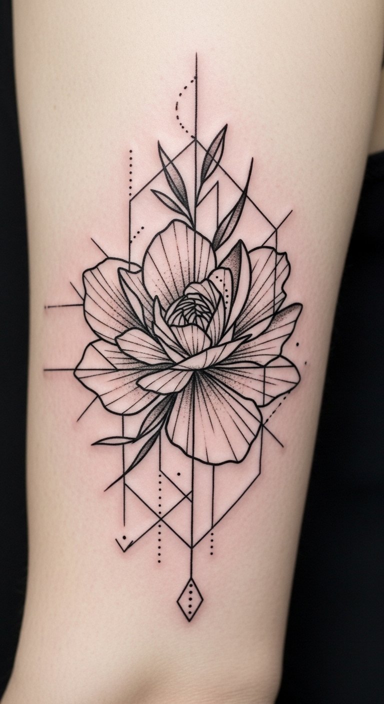 This design symbolizes the balance between natural growth and structured order, evoking feelings of empowerment and serene confidence; place it along the forearm or ribcage to follow the body’s contours and emphasize movement, or on the back of the shoulder for a bold statement that reads both intimate and architectural.