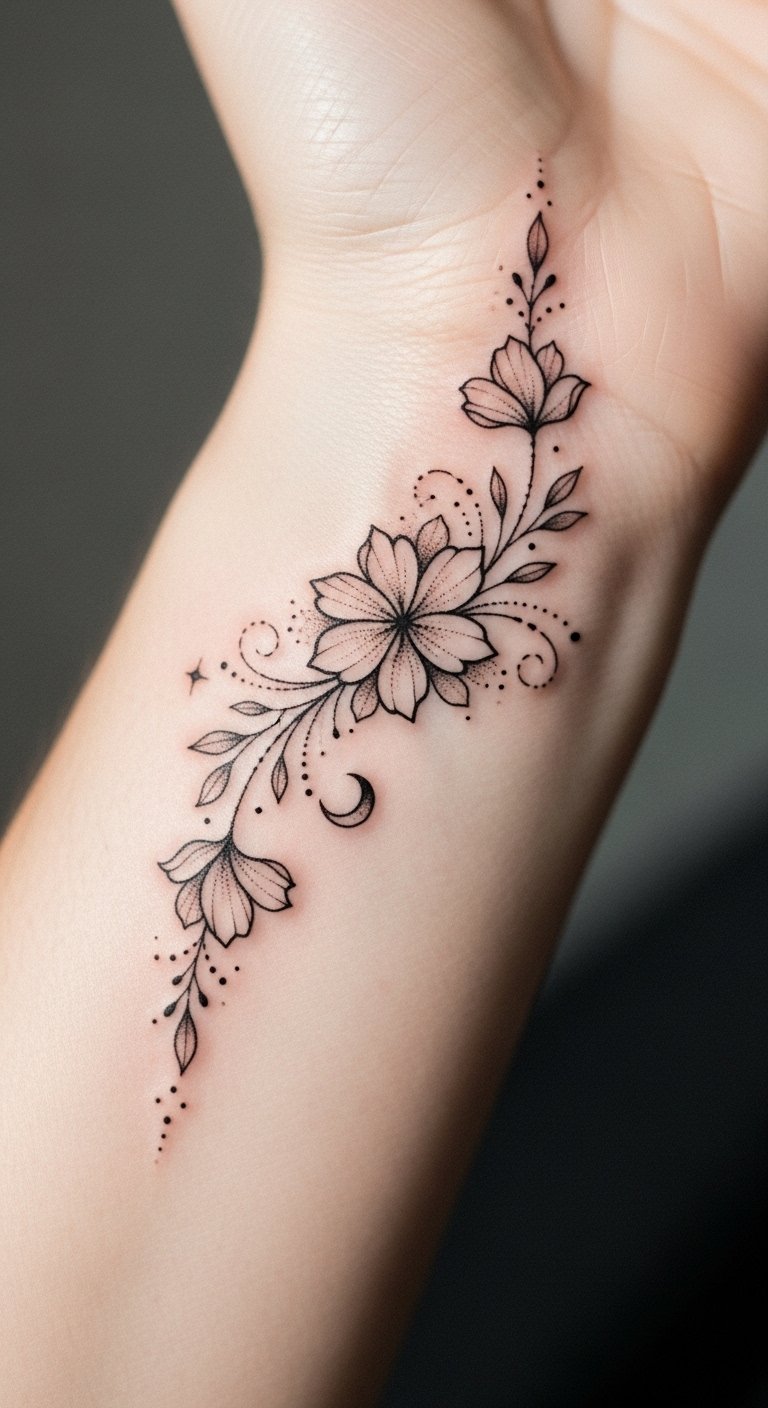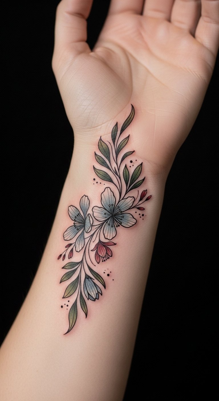 Imagine delicate petals swirling gracefully around your wrist placement, whispering stories of your spirit. Each bloom captures a moment, a memory, a dream.
