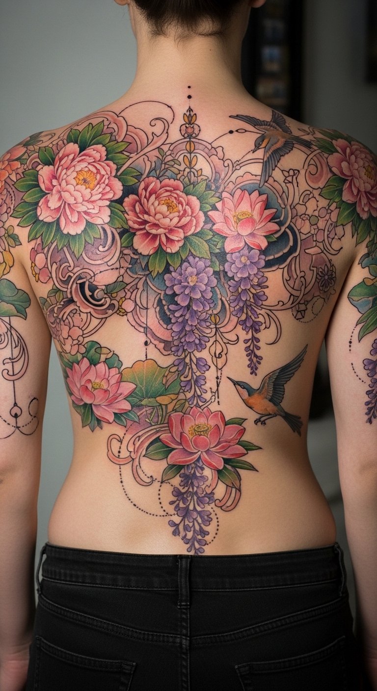 The chosen flowers symbolize growth, resilience, and renewal, while the birds and filigree suggest liberation and personal narrative; emotionally the piece aims to feel both empowering and serene, placed as a full-back centerpiece with extensions to shoulders and upper arms to integrate with existing work and movement of the body.