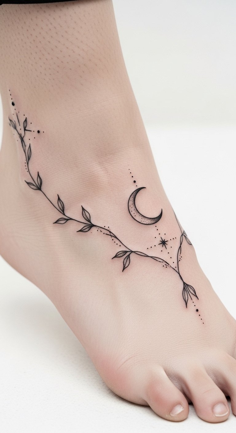 Placed along the lateral ankle and instep, it maintains an intimate, elegant presence that can be shown or concealed, evoking gentle confidence and a sense of personal narrative; the fine-line style keeps the emotion subtle and refined, suited for a mindful, discreet expression of individuality.