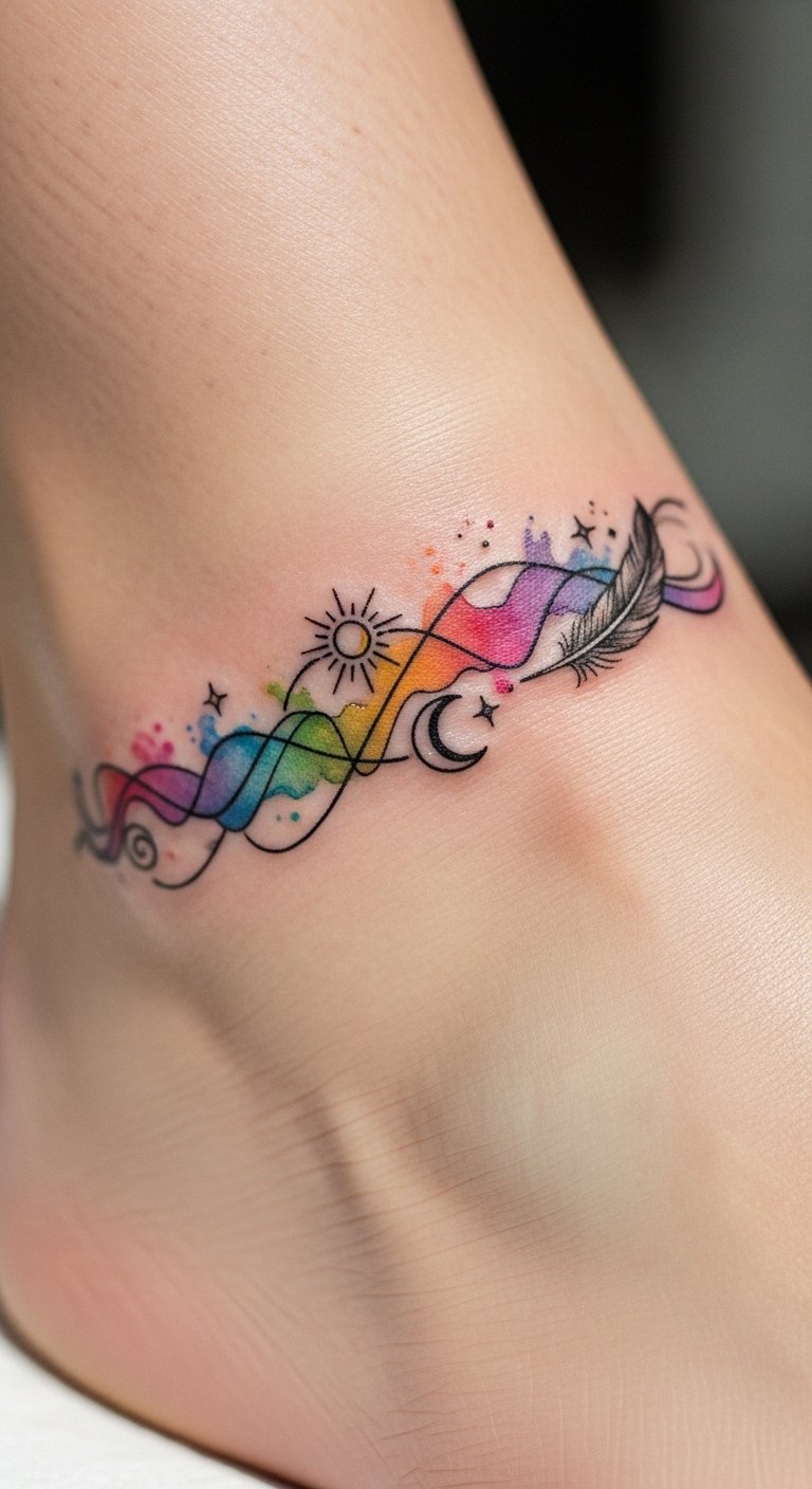Infusing personal significance into your choices transforms your tattoo from mere art into a living expression of your identity, celebrating your unique journey and freedom. This placement on the ankle or foot emphasizes intimacy and mobility: the ribbon-like watercolor suggests movement and resilience, the sun and moon represent balance between energy and rest, and the feather hints at lightness and freedom; together the elements convey personal growth and calm, meant to be seen up close and revealed selectively.