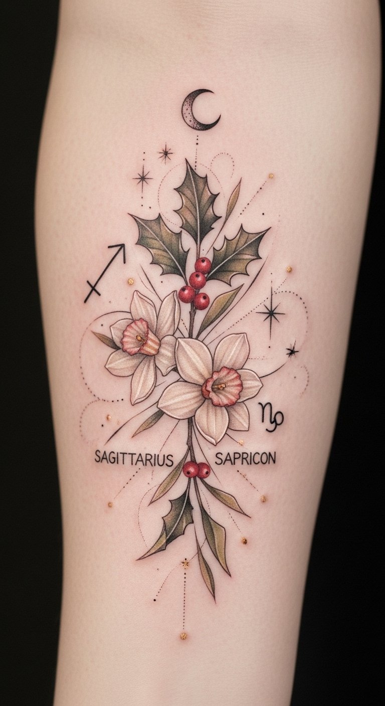 Each astrological meaning enhances the beauty of your design, making it a powerful emblem of self-expression that connects you to the cosmos. The holly and narcissus represent December’s resilience and renewal, while the Sagittarius and Capricorn glyphs add personal narrative and directional energy;