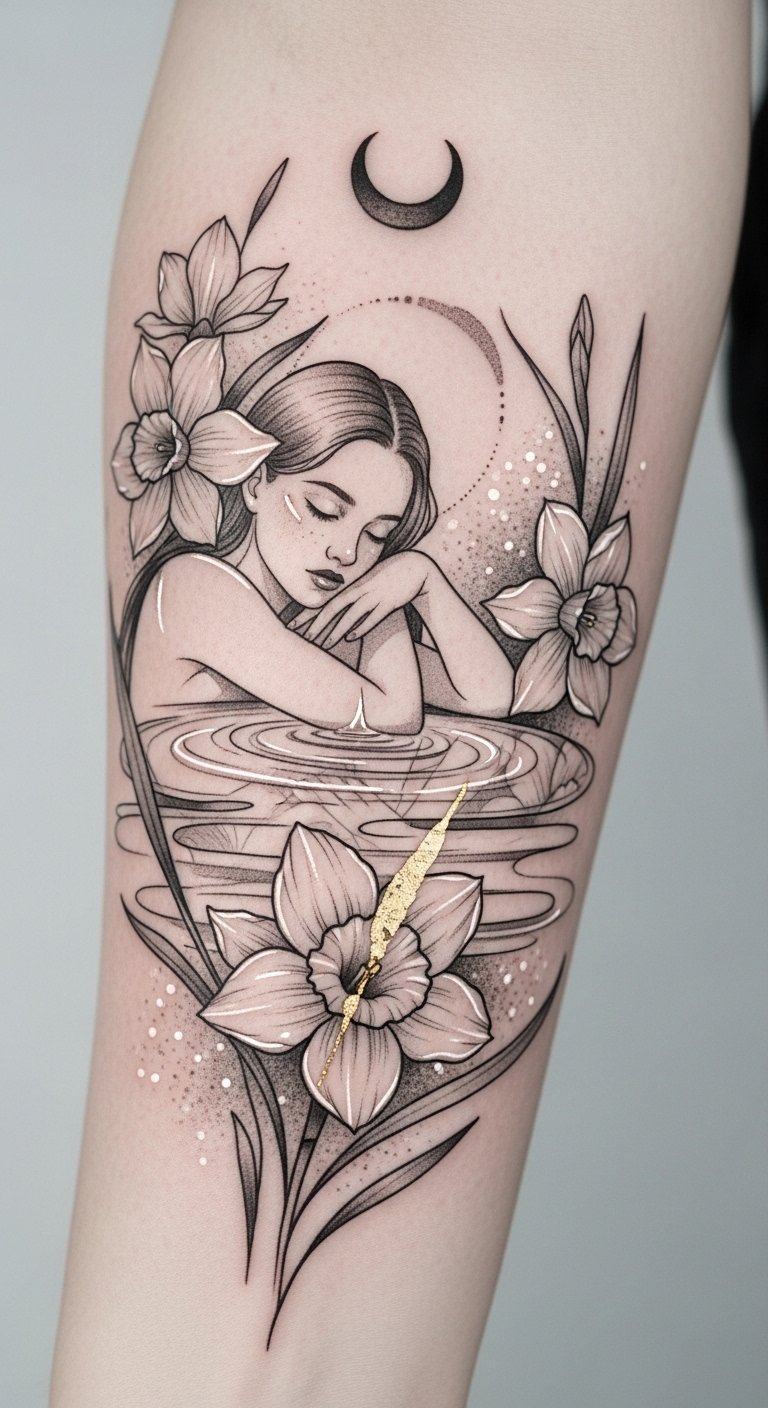 This tattoo concept blends elegance and caution: the Narcissus symbolizes alluring beauty and the reflective pool represents self-focus and introspection, while the broken mirror shard hints at fragmentation of identity.