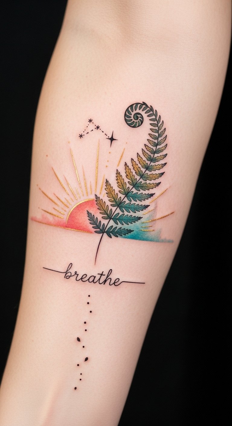 This design combines a sunrise for renewal, the unfurling fern as growth and resilience, the constellation for guidance and wonder, and the word “breathe” to anchor calm; watercolor hues convey warmth and softness, the tiny seed-like dots suggest potential, and placement along the inner forearm keeps it intimate yet visible for personal reassurance and public sharing when desired.