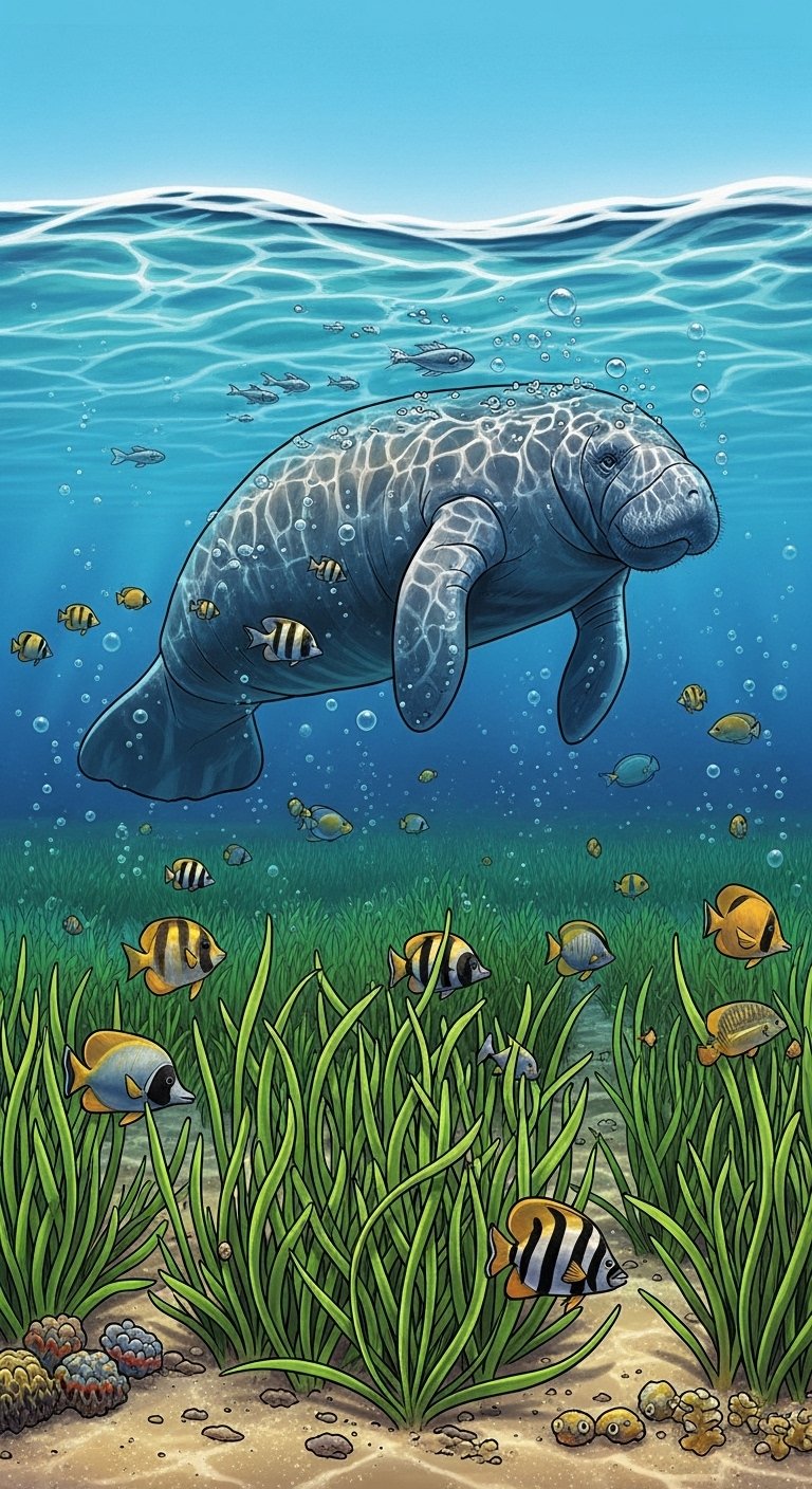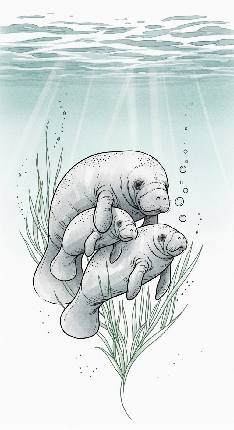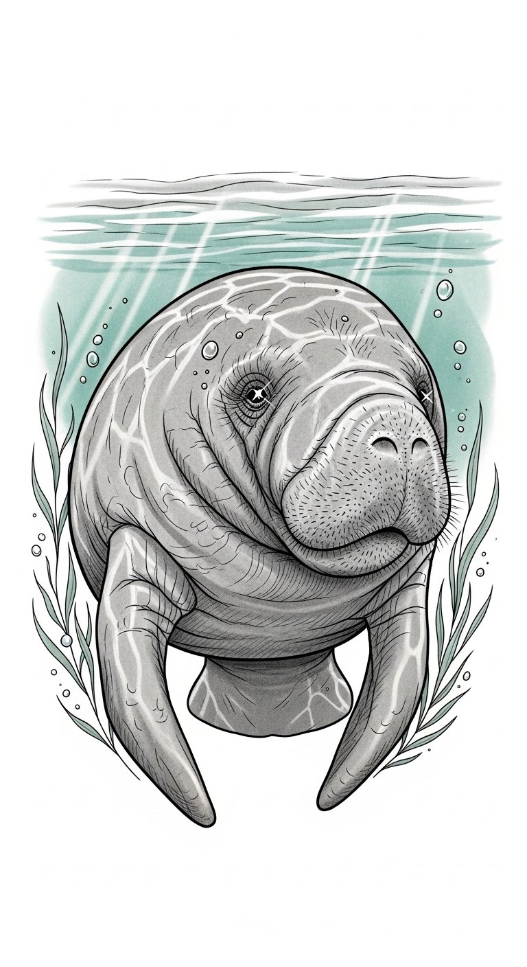 This design symbolizes harmony between species and the fragility of coastal ecosystems, evoking calm, reverence, and stewardship; rendered with flowing lines and soft shading to emphasize the manatee’s gentle presence amid dynamic details like grass blades and darting fish, it suits a forearm, calf, or upper back placement where the scene can curve with the body and be scaled to show both intimate texture and broad environmental context.