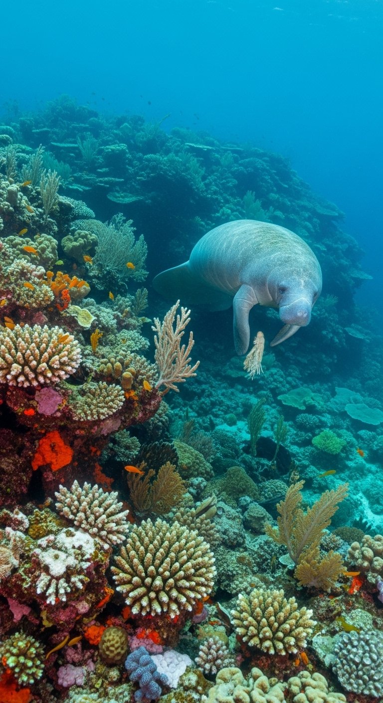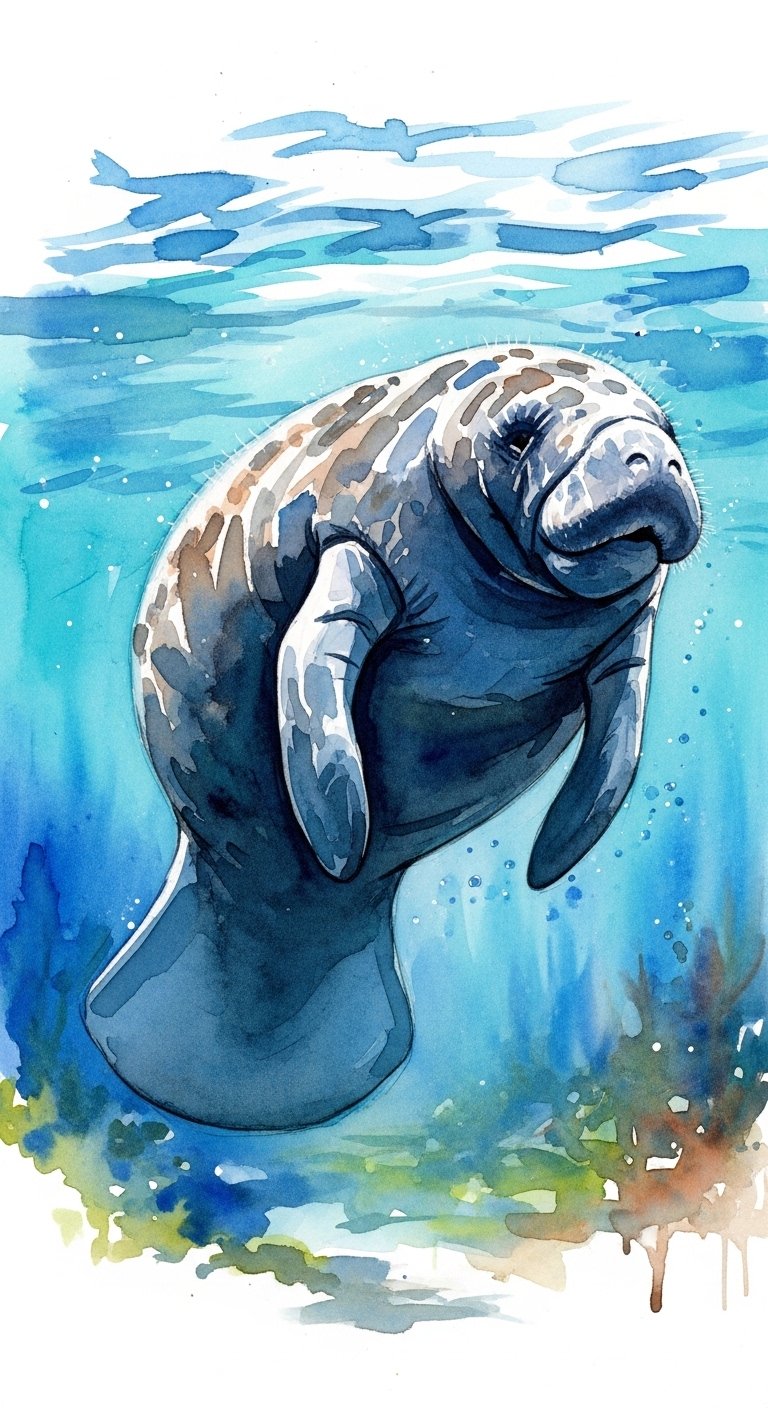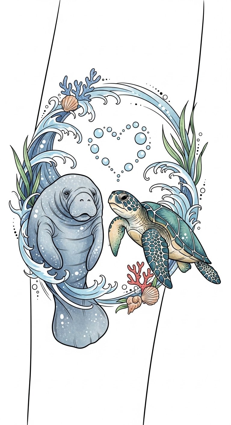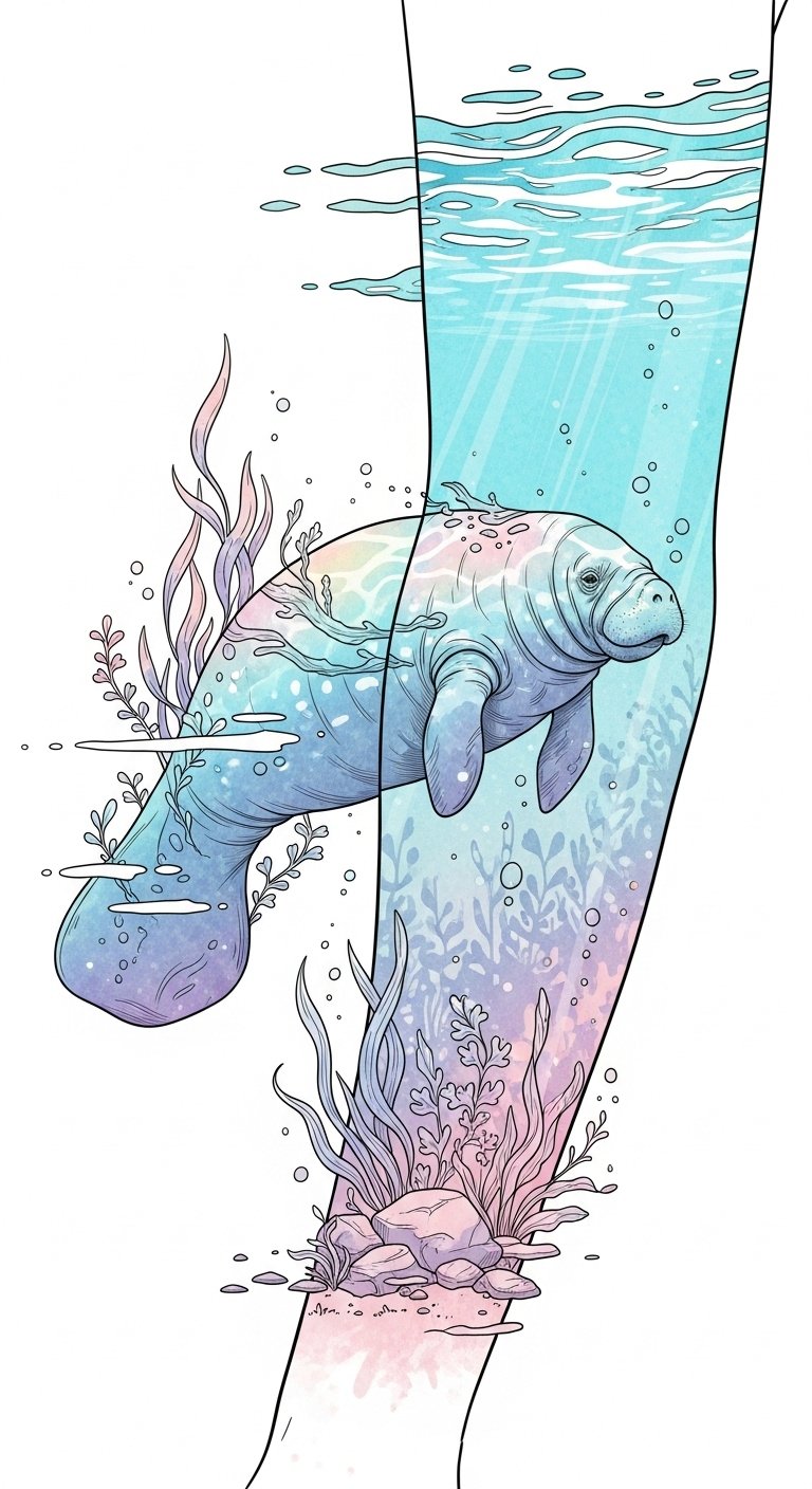A tattoo concept that places the manatee at the center, gliding horizontally across a forearm or calf, surrounded by stylized coral, seagrass, and small reef fish; soft watercolor washes for the vibrant reef contrasted with fine-line detailing on the manatee to show gentle expression and feeding motion. Symbolically it represents protection, community stewardship, and calm resilience; emotionally it conveys serenity, hope, and dedication to conservation. Suggested placement: forearm wrap, ribcage panel, or upper thigh—areas allowing flow and medium-sized color work for depth.