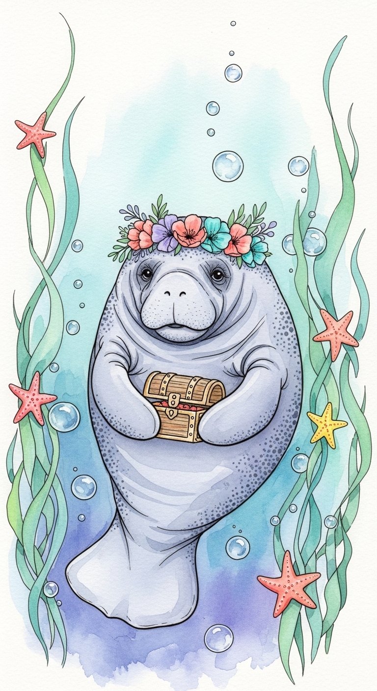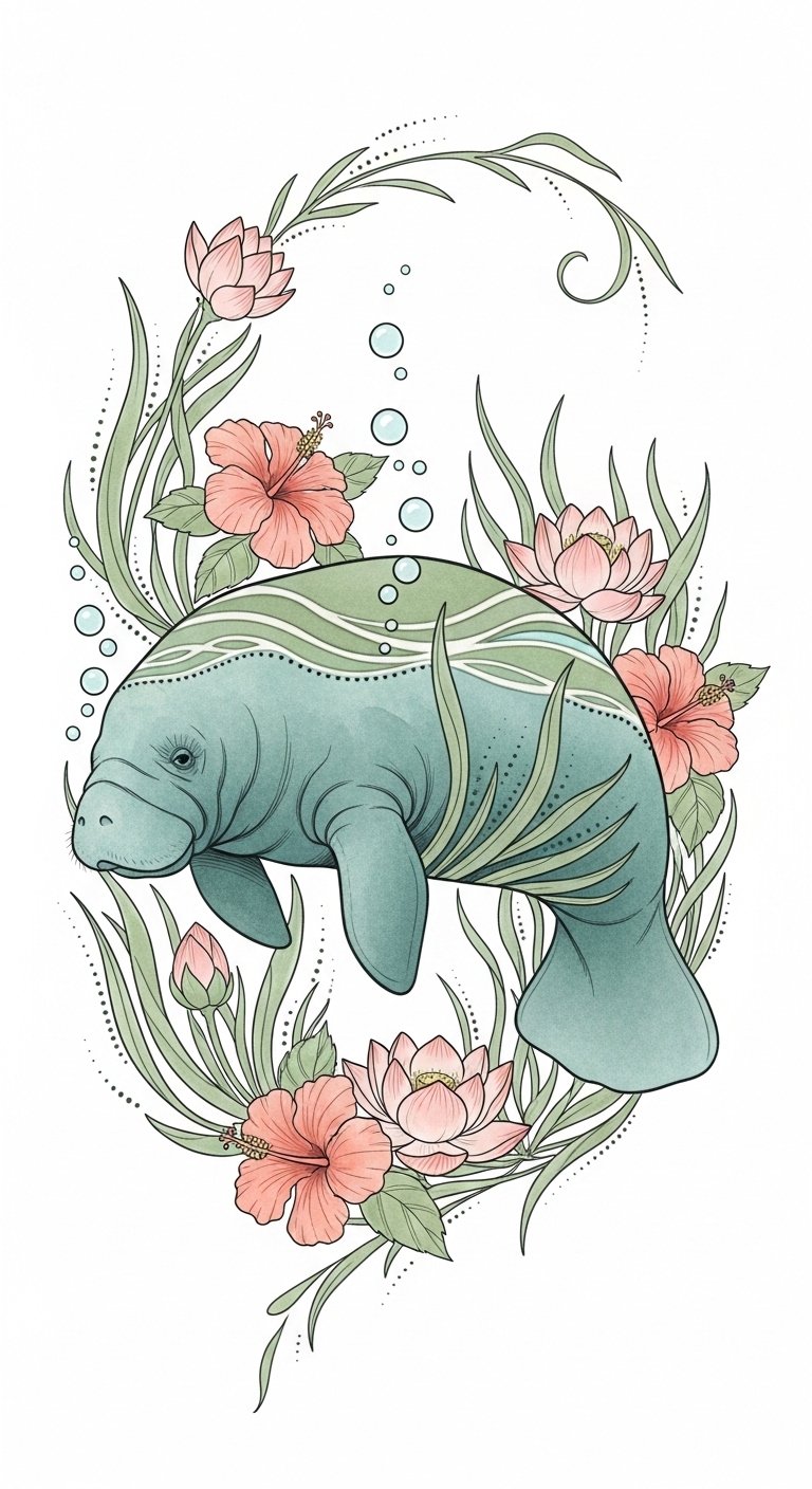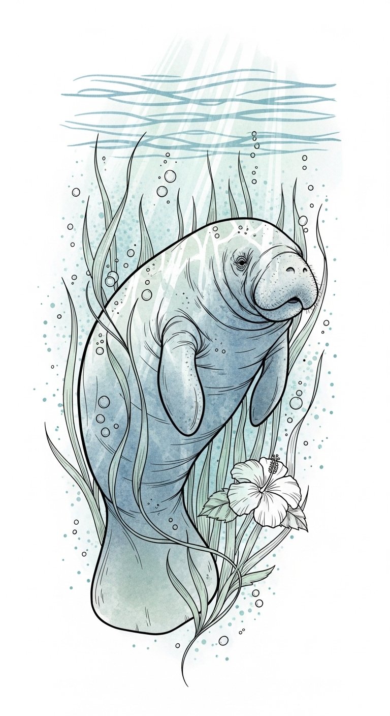 This design uses soft watercolor tones and delicate linework to convey serenity and care, the hibiscus and seagrass tying the manatee to its habitat and hinting at tropical ecosystems at risk; emotionally it evokes tenderness, stewardship, and quiet resilience.