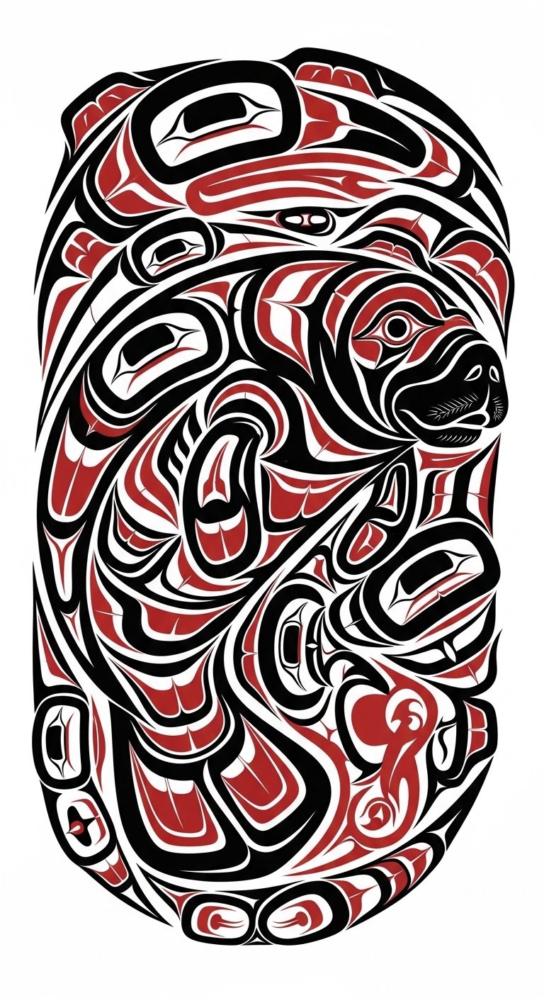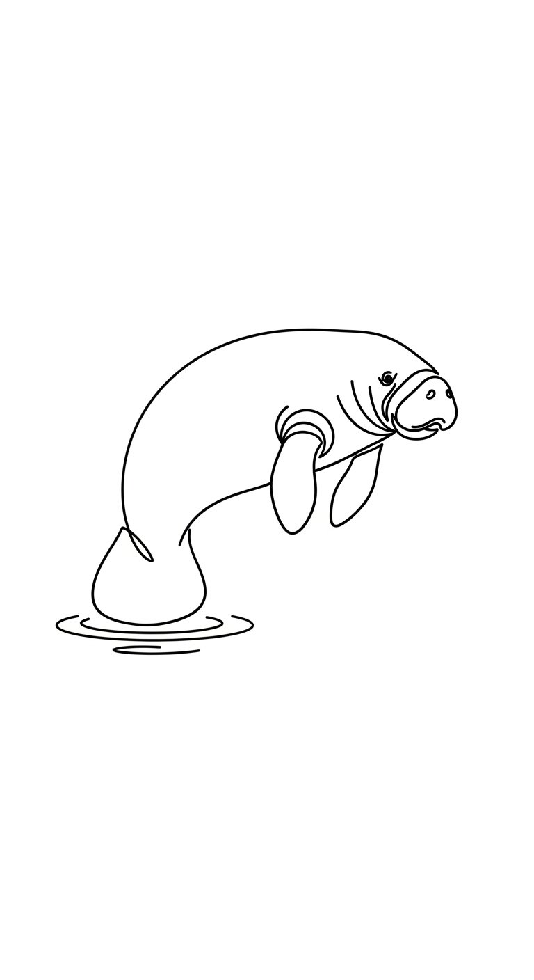 Flowing tribal manatee design rendered in bold black lines and negative space, central stylized manatee silhouette composed of interlocking swirls, waves, and geometric motifs; accent with subtle dotwork and fine line fillers, optional coastal flora elements arching around the form; dynamic curve suited for ribcage, forearm, or calf, scale to medium-large for detail clarity. This concept channels calm resilience and connection to the sea—symbolizing protection, gentle strength, and cultural continuity—evoking peacefulness and reverence; ideal placement follows body contours to enhance movement, creating an intimate, contemplative piece that reads as both personal talisman and striking visual statement.