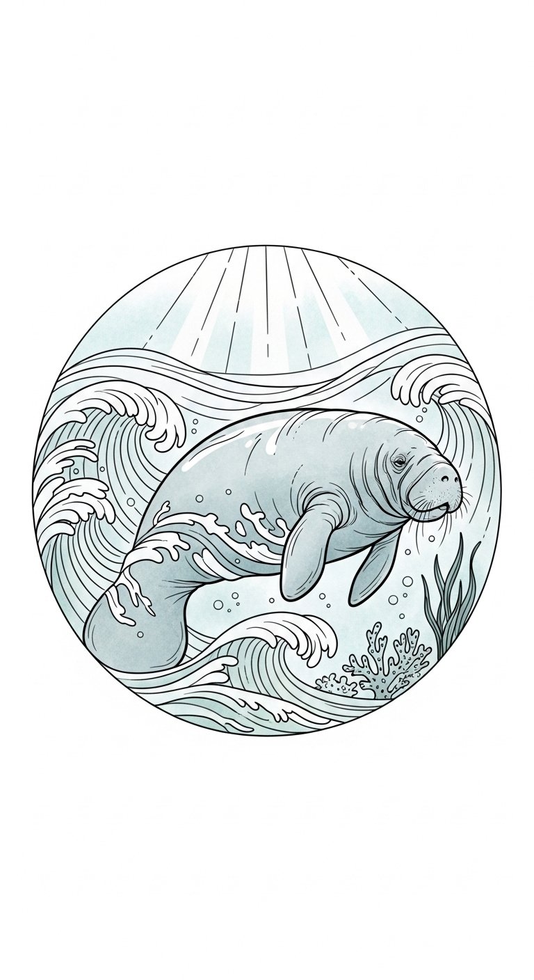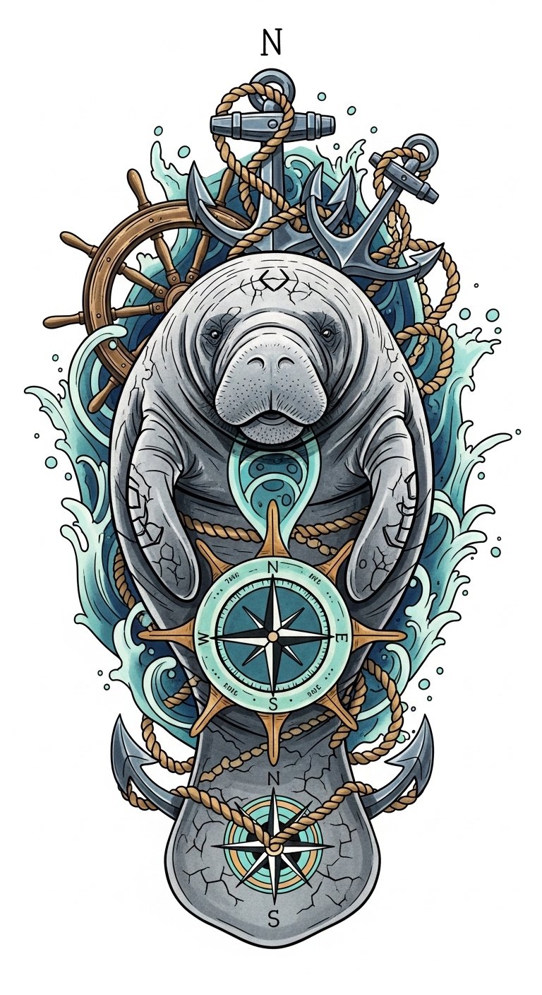 A graceful manatee cradled within a circular nautical compass, its flippers gently curving around a rope border; delicate waves and sea grass curl beneath, with a small ship wheel and anchor subtly integrated into the background, soft watercolor blues and greens with fine black linework — ideal for an upper arm or rib placement where the circular form follows the body’s curve. This design symbolizes peaceful guidance and a steady, compassionate journey through life’s currents, evoking calm, stewardship of the sea, and a personal bond to coastal heritage; placement on the upper arm or ribs keeps it intimate yet visible, allowing the wearer to display their connection to ocean conservation and quiet resilience.