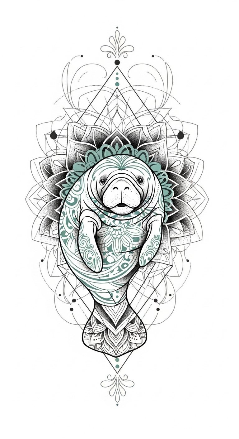 A mandala-inspired manatee tattoo beautifully merges the serene essence of these gentle giants with the intricate patterns of mandala art, creating a stunning visual representation of balance and tranquility.