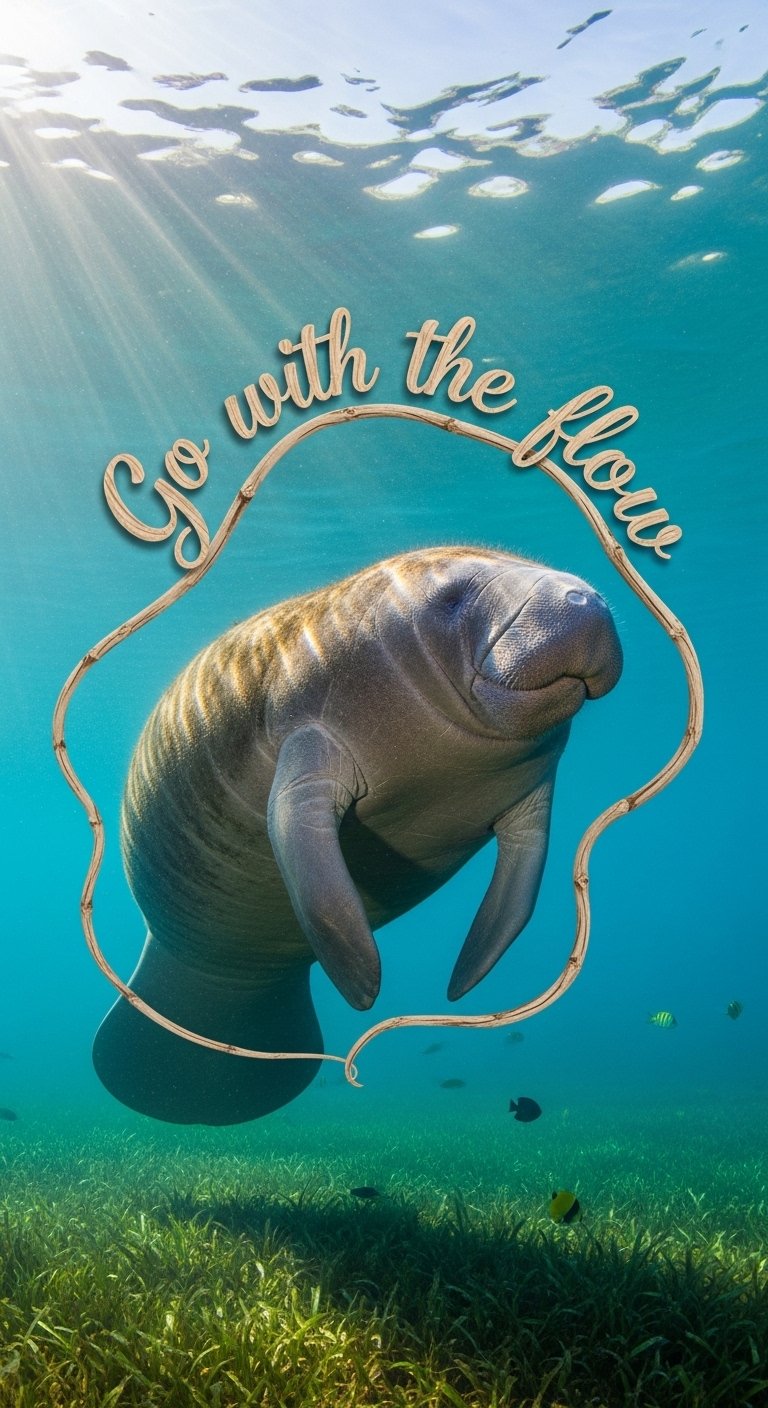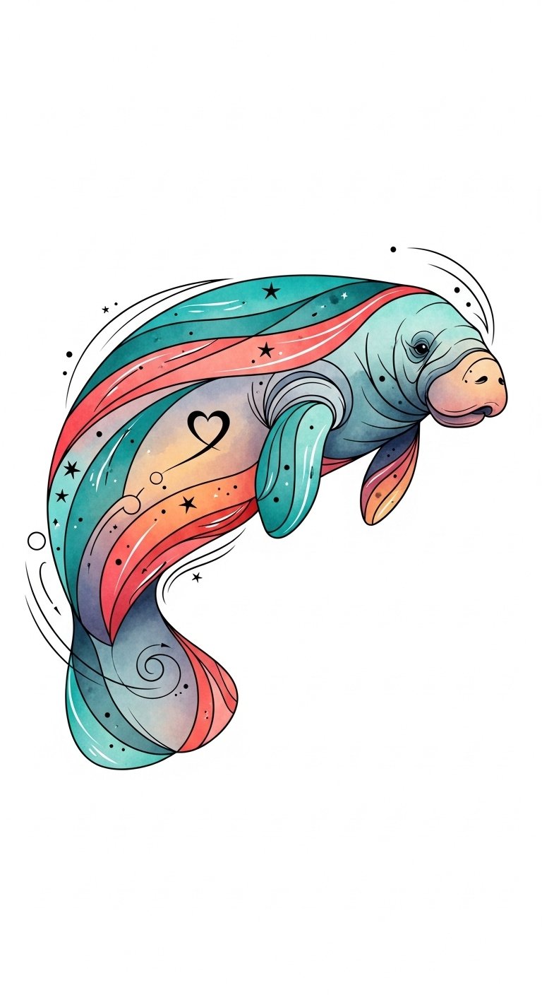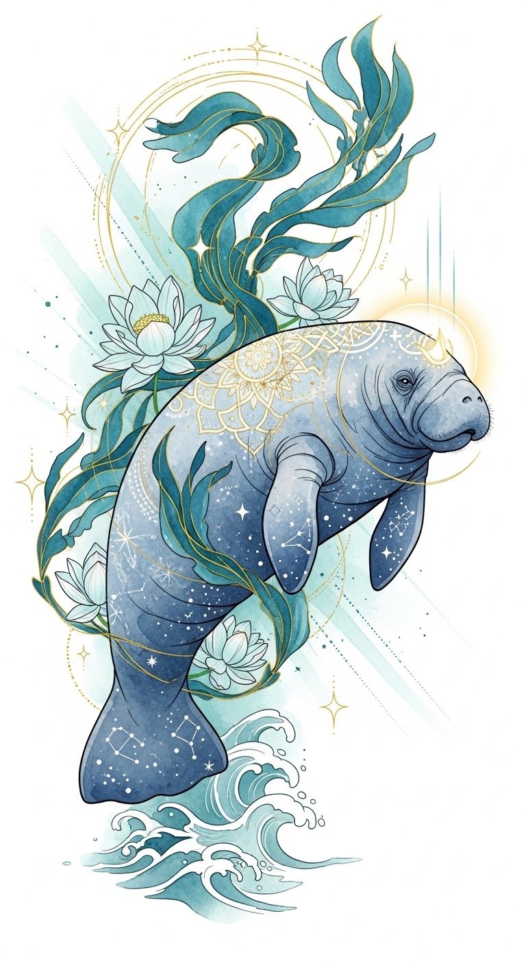 As a tattoo design concept, this image captures the tranquility and freedom of the original scene: the manatee represents gentleness and peaceful strength, the dreamlike colors and flowing plants evoke emotional calm and introspection, and the soft light suggests hope and guidance.