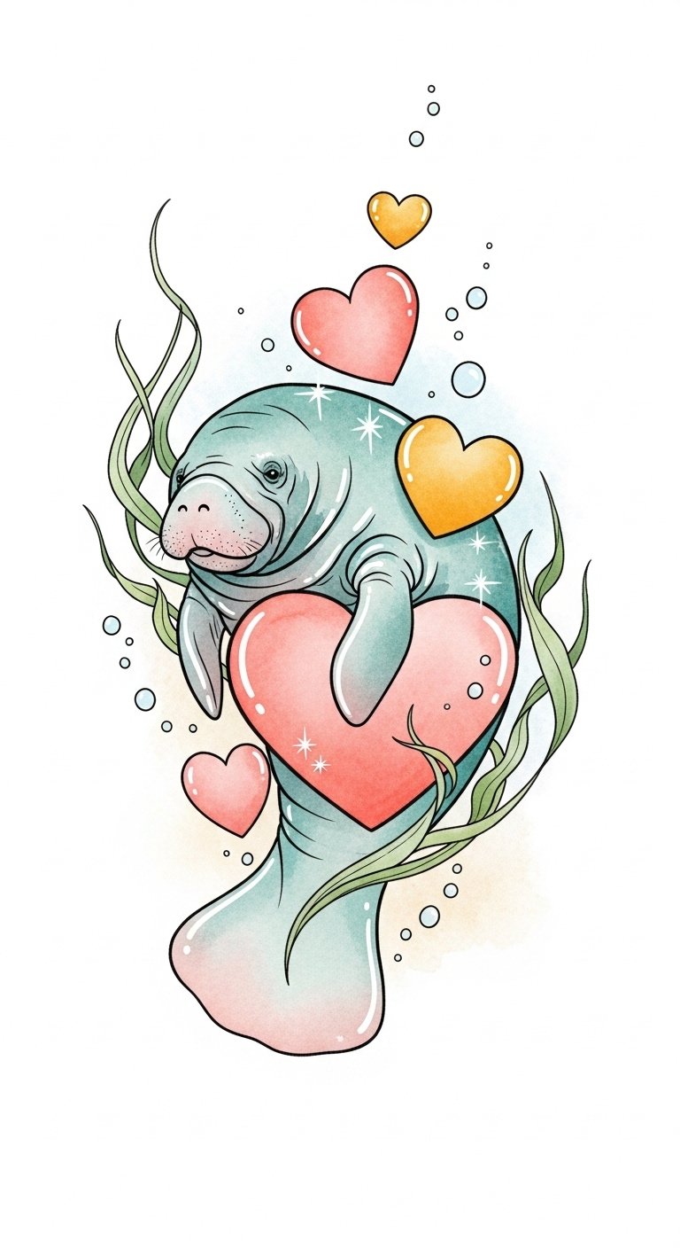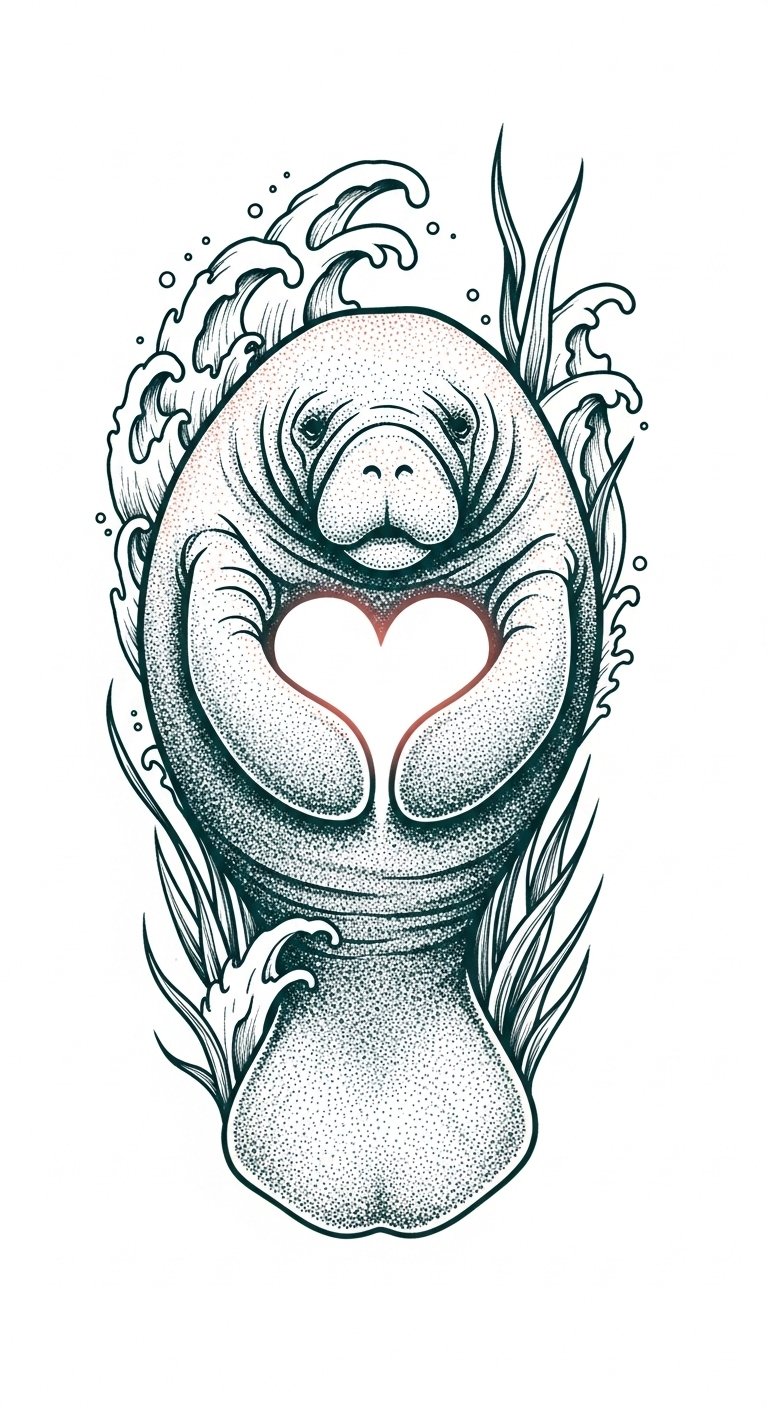 Imagine a graceful manatee entwined with vibrant hearts, symbolizing manatee love and connection to nature. This design not only embodies tenderness but also reflects your passion for marine life, creating a stunning tribute that resonates with your heart’s deepest desires and values.