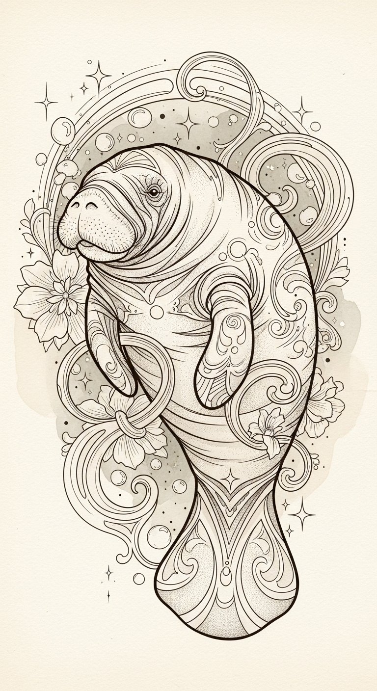 Consider placement where the flow of the manatee can follow the body’s contours—along the ribcage for an intimate piece, the upper arm for visibility, or the back for a larger, more detailed composition; emotionally it conveys calm, balance, and a deep connection to natural cycles.