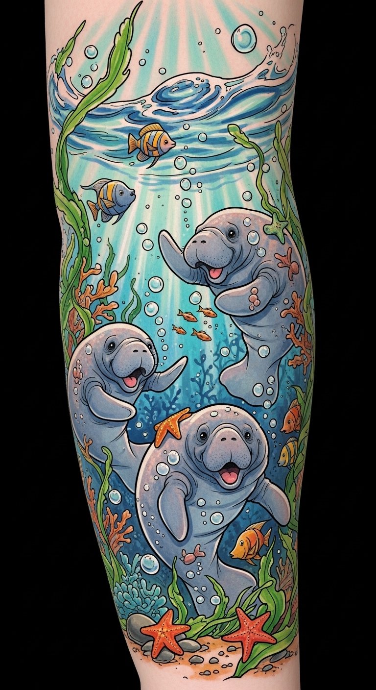 Imagine vibrant scenes of playful manatee adventures, frolicking beneath the waves, and engaging in whimsical manatee interactions with colorful sea creatures. These tattoos capture joy and freedom, reflecting your love for nature while offering a cheerful reminder of the magic beneath the surface.