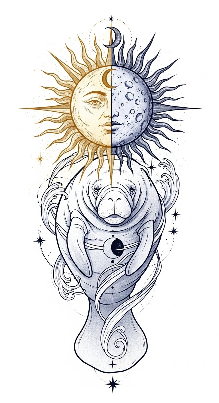 A stunning tattoo design featuring a manatee alongside the sun and moon beautifully illustrates the balance between light and dark, day and night.