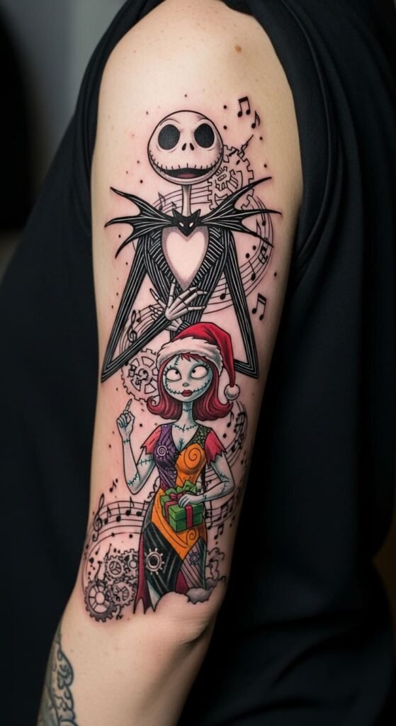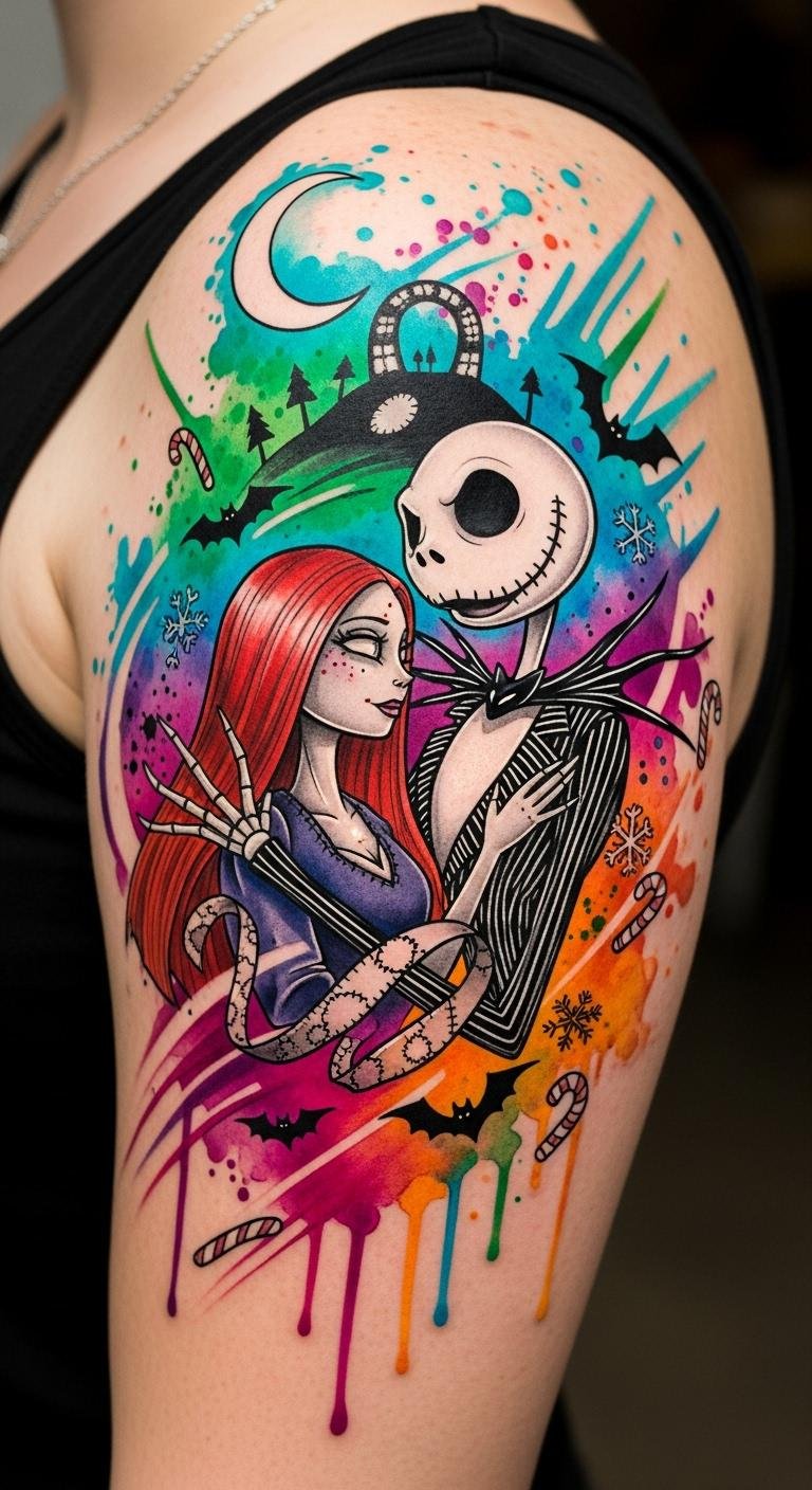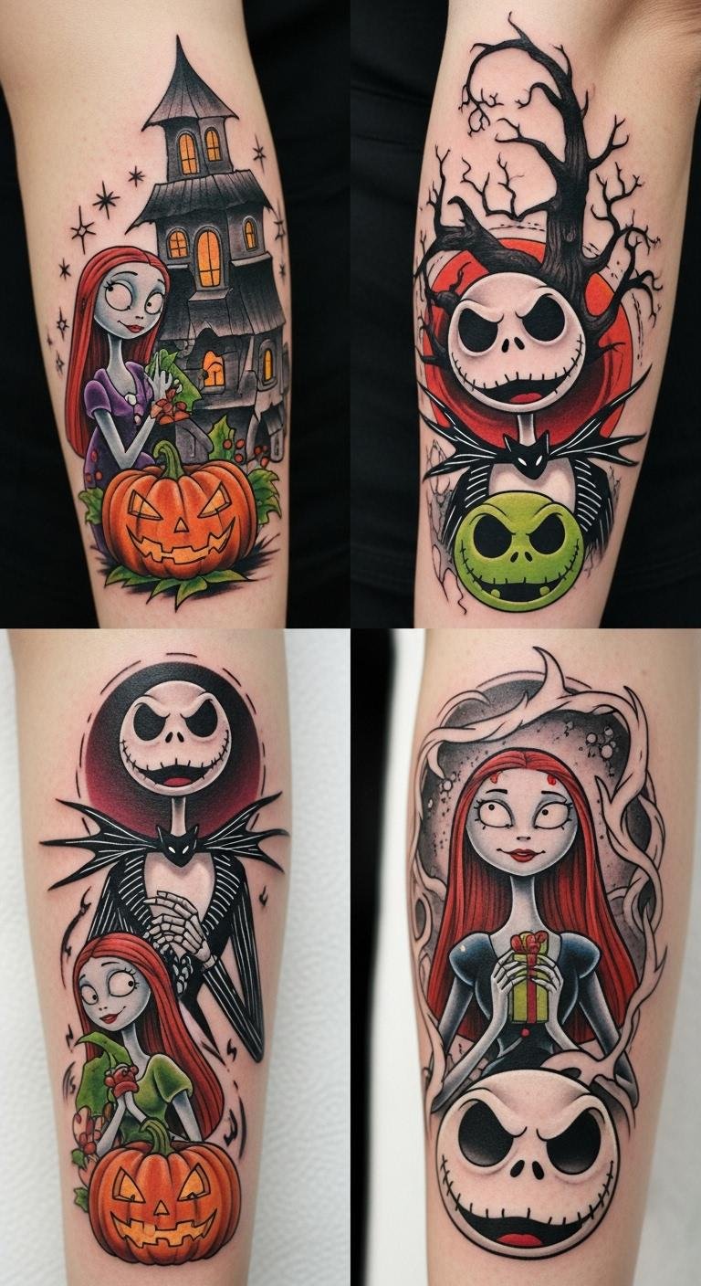 Using neo-traditional techniques, artists create stunning character reinterpretations, infusing Jack, Sally, and others with a fresh twist. These expressive designs capture the film’s whimsical essence, allowing you to showcase your passion and individuality in a striking, colorful way.