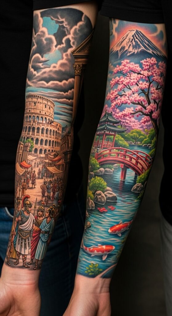 Ideal placement options include the upper arm wrap, calf, or across the shoulder blade to allow the scene’s movement and details to flow with the body’s contours.