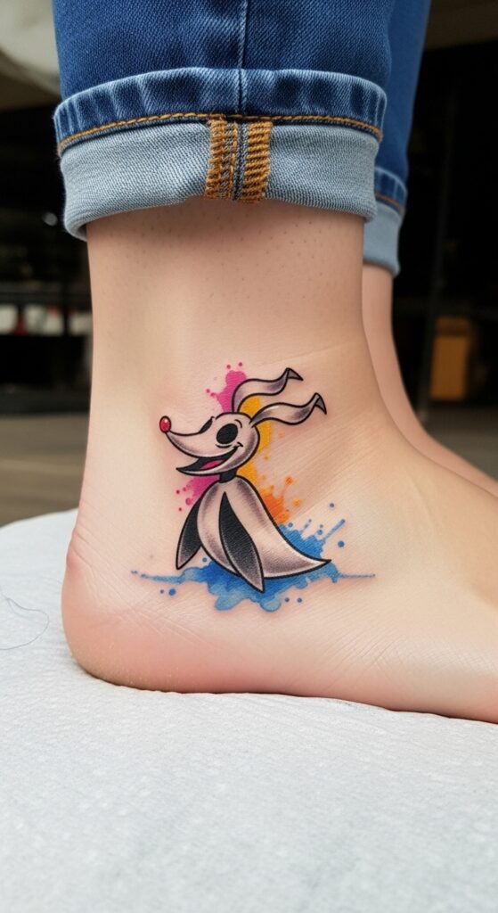 Ankle tattoos of Zero, the adorable ghost dog from “The Nightmare Before Christmas,” capture his playful spirit and whimsical charm in a compact design. A minimalist Zero design can highlight his cute companion symbolism, while colorful interpretations bring vibrancy. For unique Zero artwork, consider popular styles like watercolor. Ankle placement tips suggest keeping it small yet expressive, ensuring your Zero tattoo reflects your love for this fan favorite.