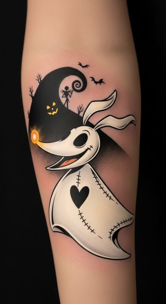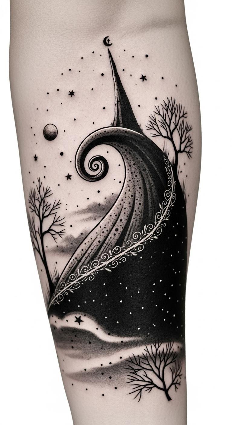 This design concept uses the film’s iconic elements to symbolize respect for source material and community: Jack Skellington and Sally clasped within a crescent moon that morphs into a stitched ribbon, half textured like a pumpkin and half like snowflake filigree. Vibrant yet slightly desaturated colors evoke nostalgia and warmth, while minimal linework around the characters keeps the image timeless. Emotionally it balances whimsy and melancholy—perfect for fans who feel both wonder and tenderness toward the story. Ideal placements are the inner forearm for visibility and storytelling, the upper back shoulder for larger detail, or the ribcage for a more intimate, personal piece.